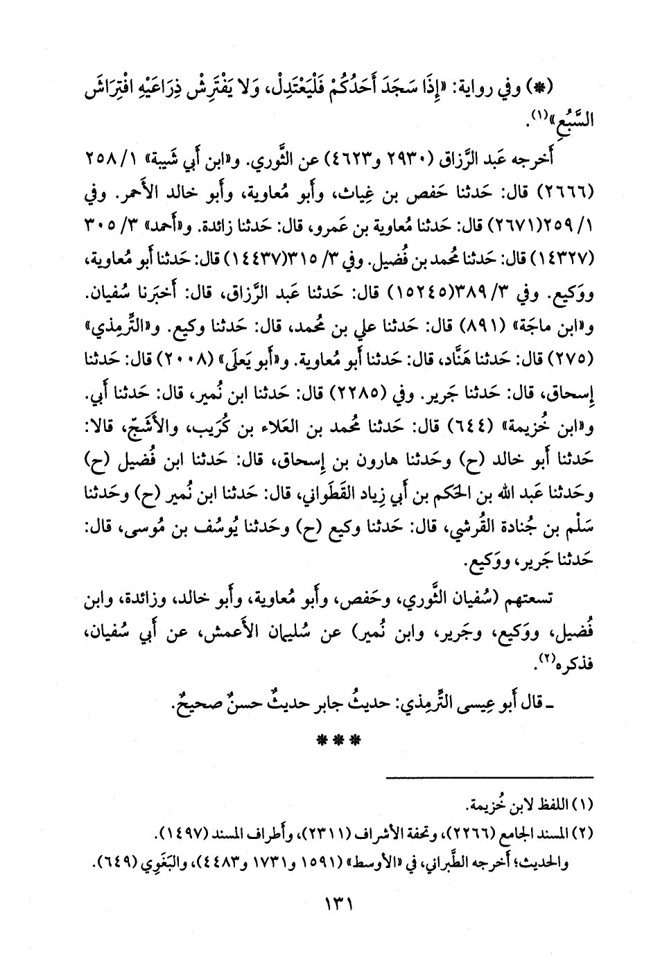 و «التِّرمِذي» (٢٧٥) قال: حدثنا هَنَّاد، قال: حدثنا أَبو معاوية. و «أَبو يَعلى» (٢٠٠٨) قال: حدثنا إسحاق، قال: حدثنا جَرير. وفي (٢٢٨٥) قال: حدثنا ابن نُمير، قال: حدثنا أبي. و «ابن خزيمة» (٦٤٤) قال: حدثنا محمد بن العلاء بن كُريب، والأشج، قالا: حدثنا أَبو خالد (ح) وحدثنا هارون بن إسحاق، قال: حدثنا ابن فضيل (ح) وحدثنا عبد الله بن الحكم بن أبي زياد القطواني، قال: حدثنا ابن نُمير (ح) وحدثنا سَلْم بن جُنادة القرشي، قال: حدثنا وكيع (ح) وحدثنا يوسف بن موسى، قال: حدثنا جرير، ووكيع.