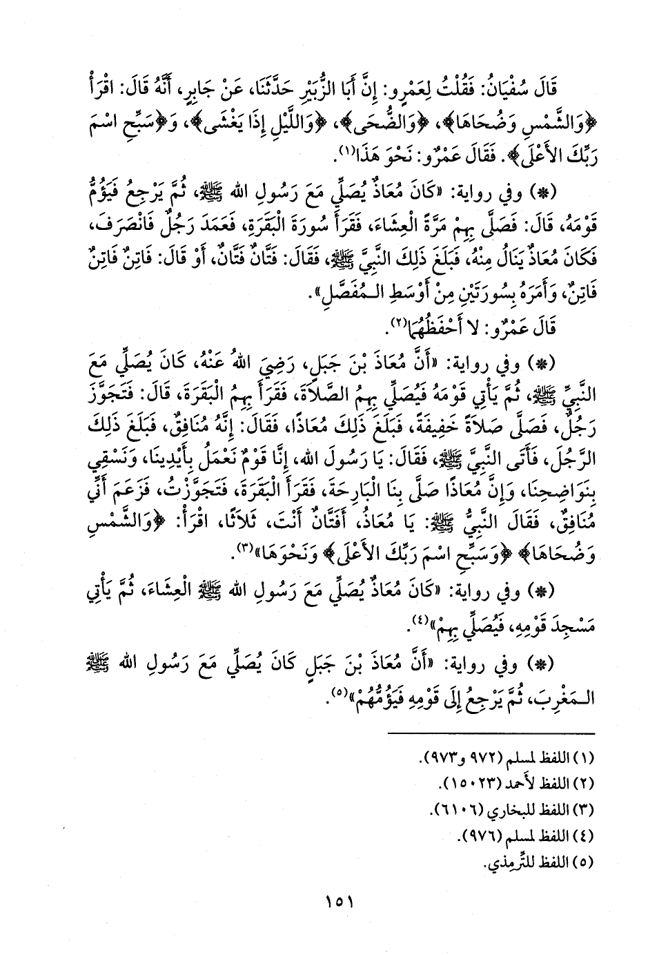 - وفي رواية: «أن معاذ بن جبل، رضي الله عنه، كان يصلي مع النبي صَلى الله عَليه وسَلم ثم يأتي قومه فيصلي بهم الصلاة، فقرأ بهم البقرة، قال: فتجوز رجل، فصلى صلاة خفيفة، فبلغ ذلك معاذا، فقال: إنه منافق، فبلغ ذلك الرجل، فأتى النبي صَلى الله عَليه وسَلم فقال: يا رسول الله، إنا قوم نعمل بأيدينا، ونسقي بنواضحنا، وإن معاذا صلى بنا البارحة، فقرأ البقرة، فتجوزت، فزعم أني منافق، فقال النبي صَلى الله عَليه وسَلم: يا معاذ، أفتان أنت، ثلاثا، اقرأ: {والشمس وضحاها}، و {سَبِّحِ اسْمَ رَبِّكَ الأَعْلَى} ونحوها» (¬١).