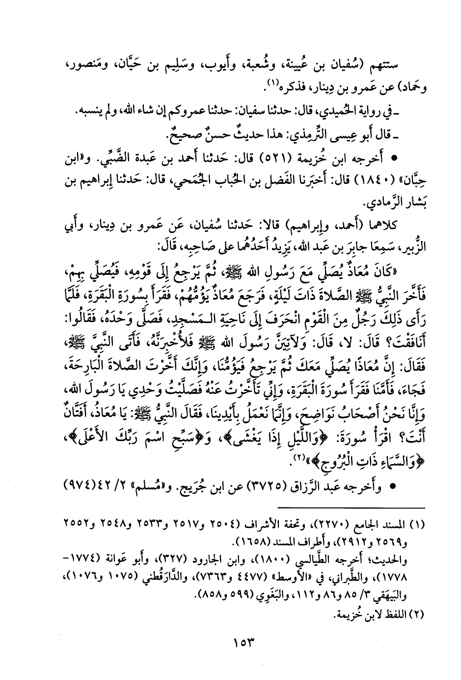 «كان معاذ يصلي مع رسول الله صَلى الله عَليه وسَلم ثم يرجع إلى قومه، فيصلي بهم، فأخر النبي صَلى الله عَليه وسَلم الصلاة ذات ليلة، فرجع معاذ يؤمهم، فقرأ بسورة البقرة، فلما رأى ذلك رجل من القوم انحرف إلى ناحية المسجد، فصلى وحده، فقالوا: أنافقت؟ قال: لا، قال: ولآتين رسول الله صَلى الله عَليه وسَلم فلأخبرنه، فأتى النبي صَلى الله عَليه وسَلم فقال: إن معاذا يصلي معك ثم يرجع فيؤمنا، وإنك أخرت الصلاة البارحة، فجاء، فأمنا فقرأ سورة البقرة، وإني تأخرت عنه فصليت وحدي يا رسول الله، وإنا نحن أصحاب نواضح، وإنما نعمل بأيدينا، فقال النبي صَلى الله عَليه وسَلم: يا معاذ، أفتان أنت؟ اقرأ سورة: {والليل إذا يغشى}، و {سَبِّحِ اسْمَ رَبِّكَ الأَعْلَى}، {والسماء ذات البروج}» (¬٢).