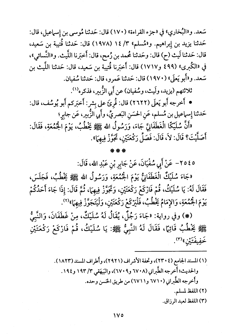 «أن سليكا الغطفاني جاء، ورسول الله صَلى الله عَليه وسَلم يخطب، يوم الجمعة، فقال: أصليت؟ قال: لا, قال: فصل ركعتين، تجوز فيهما».