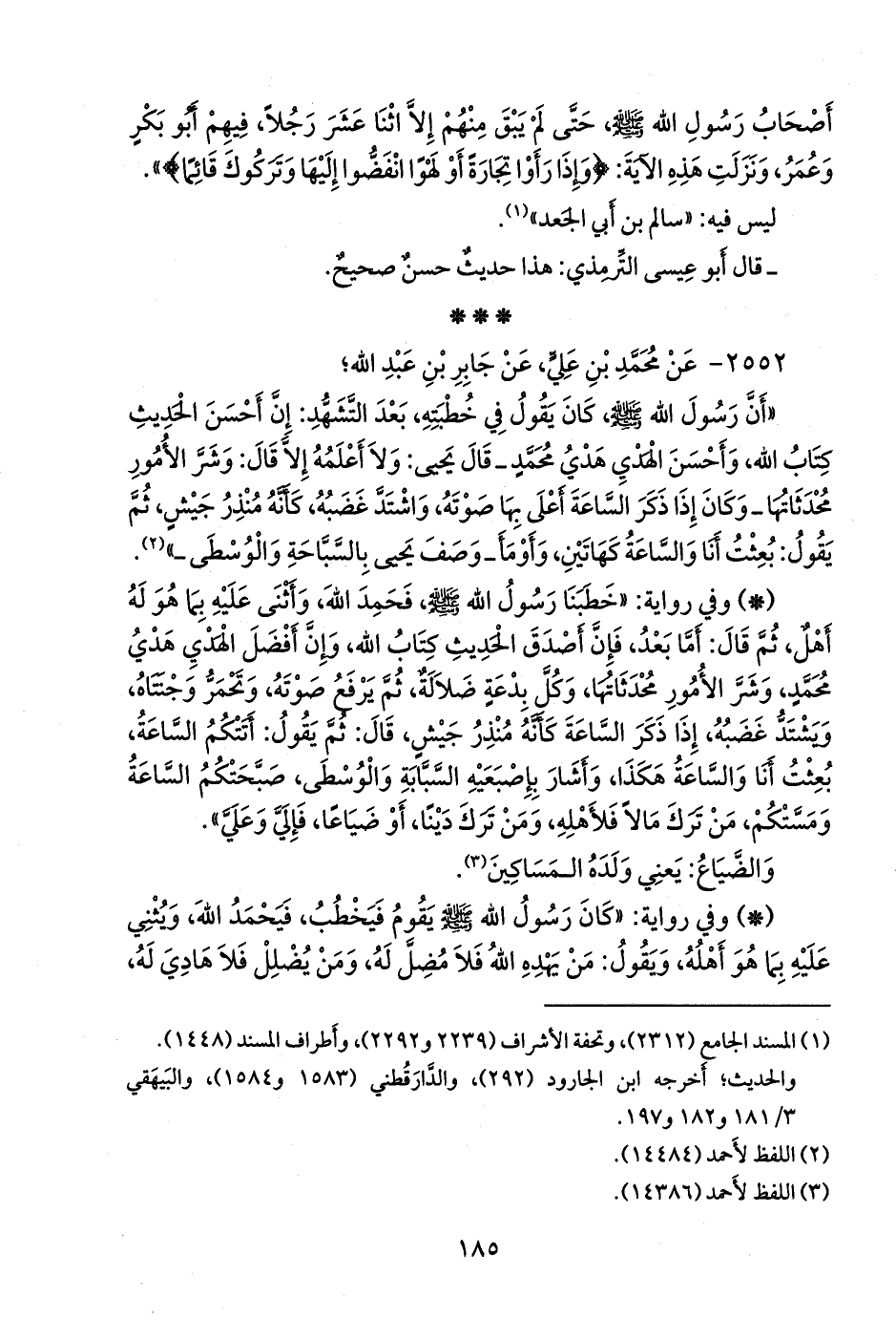 - وفي رواية: «خطبنا رسول الله صَلى الله عَليه وسَلم فحمد الله، وأثنى عليه بما هو له أهل، ثم قال: أما بعد، فإن أصدق الحديث كتاب الله، وإن أفضل الهدي هدي محمد، وشر الأمور محدثاتها، وكل بدعة ضلالة، ثم يرفع صوته، وتحمر وجنتاه، ويشتد غضبه، إذا ذكر الساعة كأنه منذر جيش، قال: ثم يقول: أتتكم الساعة، بعثت أنا والساعة هكذا، وأشار بإصبعيه السبابة والوسطى، صبحتكم الساعة ومستكم، من ترك مالا فلأهله، ومن ترك دينا، أو ضياعا، فإلي وعلي».