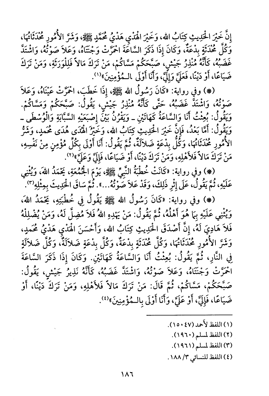 - وفي رواية: «كان رسول الله صَلى الله عَليه وسَلم إذا خطب، احمرت عيناه، وعلا صوته، واشتد غضبه، حتى كأنه منذر جيش، يقول: صبحكم ومساكم. ويقول: بعثت أنا والساعة كهاتين، ويقرن بين إصبعيه السبابة والوسطى، ويقول: أما بعد، فإن خير الحديث كتاب الله، وخير الهدى هدى محمد، وشر الأمور محدثاتها، وكل بدعة ضلالة، ثم يقول: أنا أولى بكل مؤمن من نفسه، من ترك مالا فلأهله، ومن ترك دينا، أو ضياعا، فإلي وعلي» (¬١).