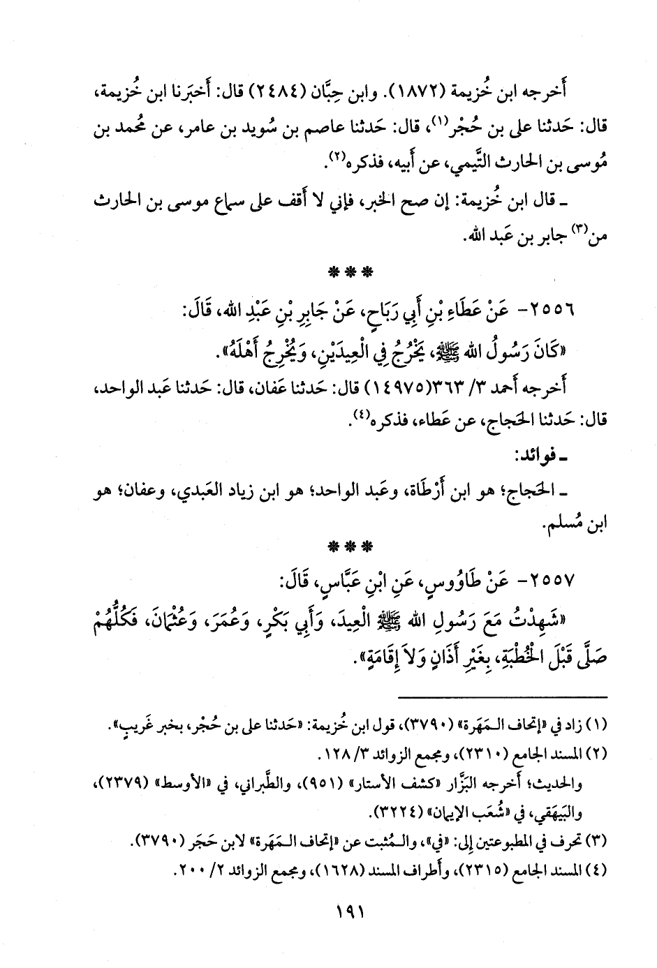 «شهدت مع رسول الله صَلى الله عَليه وسَلم العيد، وأَبي بكر، وعمر، وعثمان، فكلهم صلى قبل الخطبة، بغير أذان ولا إقامة».