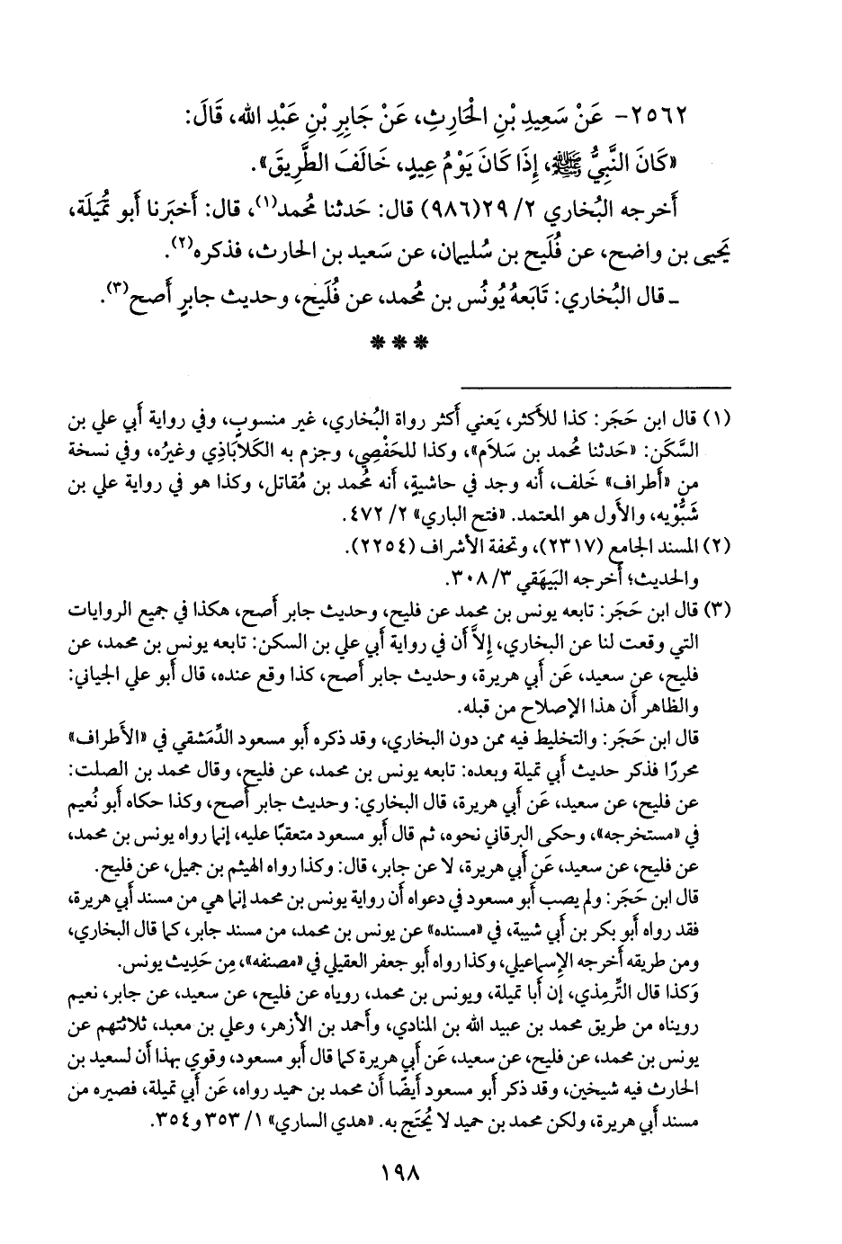 (¬٣) قال ابن حجر: تابعه يونس بن محمد عن فليح، وحديث جابر أصح، هكذا في جميع الروايات التي وقعت لنا عن البخاري، إلا أن في رواية أبي علي بن السكن: تابعه يونس بن محمد، عن فليح، عن سعيد، عن أبي هريرة، وحديث جابر أصح، كذا وقع عنده، قال أَبو علي الجياني: والظاهر أن هذا الإصلاح من قبله.