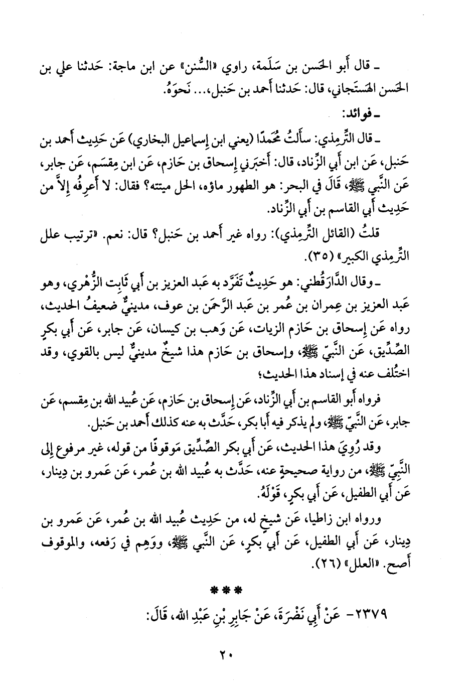 قلت، القائل التِّرمِذي: رواه غير أحمد بن حنبل؟ قال: نعم. «ترتيب علل التِّرمِذي الكبير» (٣٥).