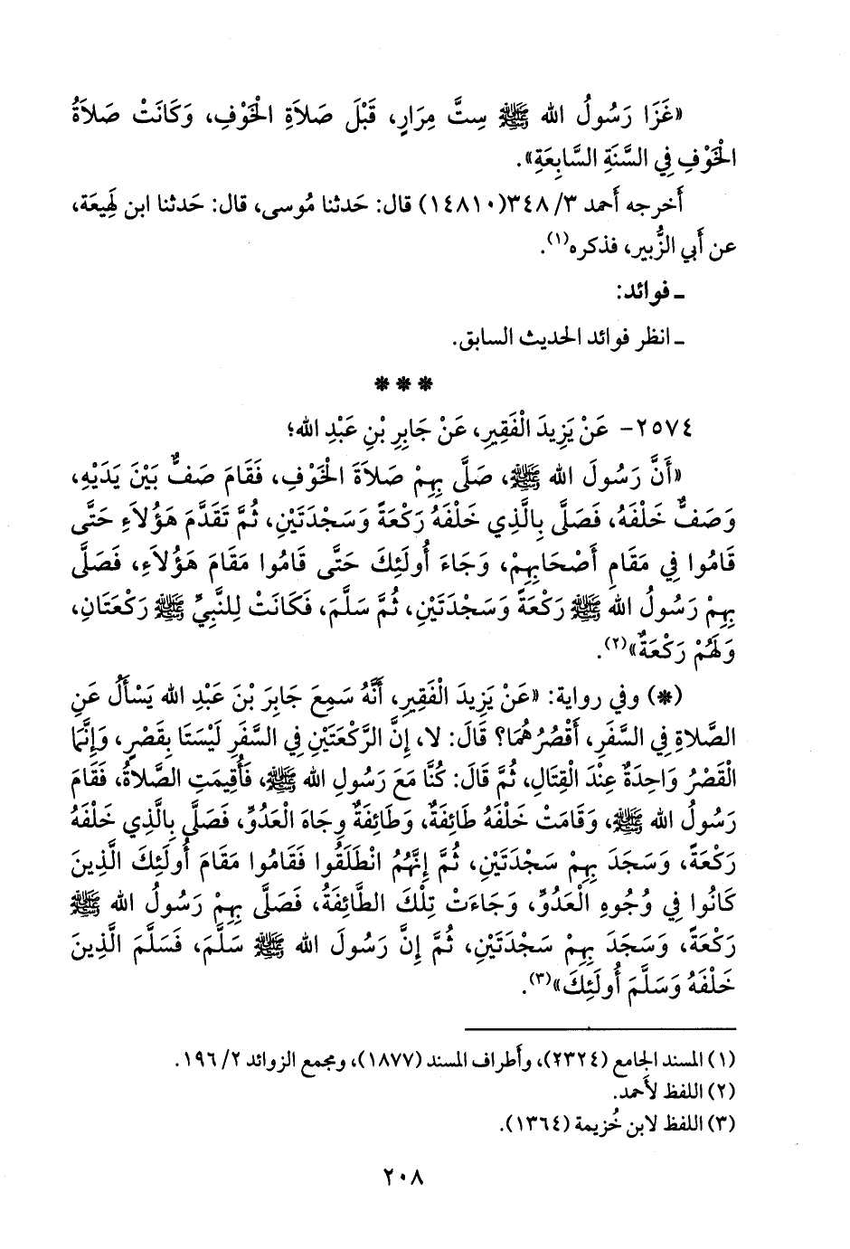- وفي رواية: «عن يزيد الفقير، أنه سمع جابر بن عبد الله يسأل عن الصلاة في السفر، أقصرهما؟ قال: لا، إن الركعتين في السفر ليستا بقصر، وإنما القصر واحدة عند القتال، ثم قال: كنا مع رسول الله صَلى الله عَليه وسَلم فأقيمت الصلاة، فقام رسول الله صَلى الله عَليه وسَلم وقامت خلفه طائفة، وطائفة وجاه العدو، فصلى بالذي خلفه ركعة، وسجد بهم سجدتين، ثم إنهم انطلقوا فقاموا مقام أولئك الذين كانوا في وجوه العدو، وجاءت تلك الطائفة، فصلى بهم رسول الله صَلى الله عَليه وسَلم ركعة، وسجد بهم سجدتين، ثم إن رسول الله صَلى الله عَليه وسَلم سلم، فسلم الذين خلفه وسلم أولئك» (¬٢).