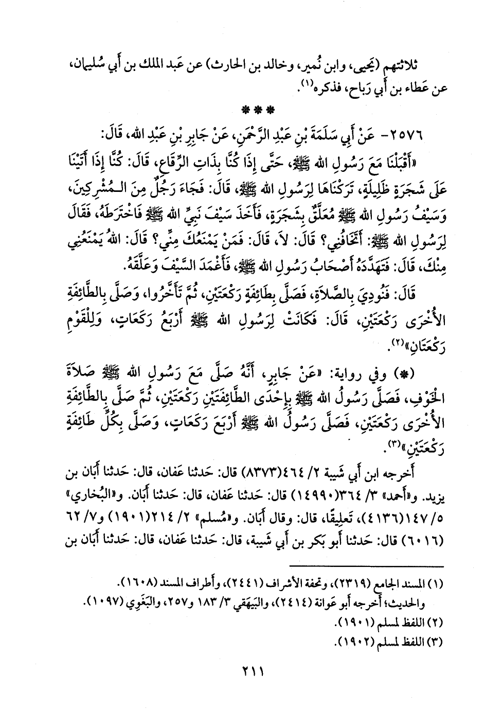 - وفي رواية: «عن جابر، أنه صلى مع رسول الله صَلى الله عَليه وسَلم صلاة الخوف، فصلى رسول الله صَلى الله عَليه وسَلم بإحدى الطائفتين ركعتين، ثم صلى بالطائفة الأخرى ركعتين، فصلى رسول الله صَلى الله عَليه وسَلم أربع ركعات، وصلى بكل طائفة ركعتين» (¬٢).
