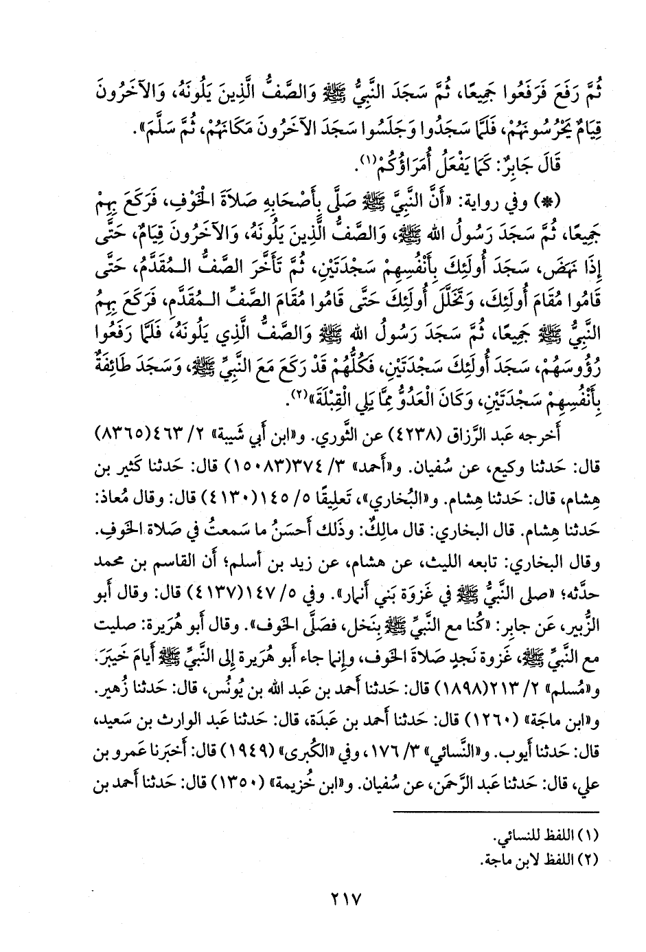 - وفي رواية: «أن النبي صَلى الله عَليه وسَلم صلى بأصحابه صلاة الخوف، فركع بهم جميعا، ثم سجد رسول الله صَلى الله عَليه وسَلم والصف الذين يلونه، والآخرون قيام، حتى إذا نهض، سجد أولئك بأنفسهم سجدتين، ثم تأخر الصف المقدم، حتى قاموا مقام أولئك، وتخلل أولئك حتى قاموا مقام الصف المقدم، فركع بهم النبي صَلى الله عَليه وسَلم جميعا، ثم سجد رسول الله صَلى الله عَليه وسَلم والصف الذي يلونه، فلما رفعوا رؤوسهم، سجد أولئك سجدتين، فكلهم قد ركع مع النبي صَلى الله عَليه وسَلم وسجد طائفة بأنفسهم سجدتين، وكان العدو مما يلي القبلة» (¬٢).
