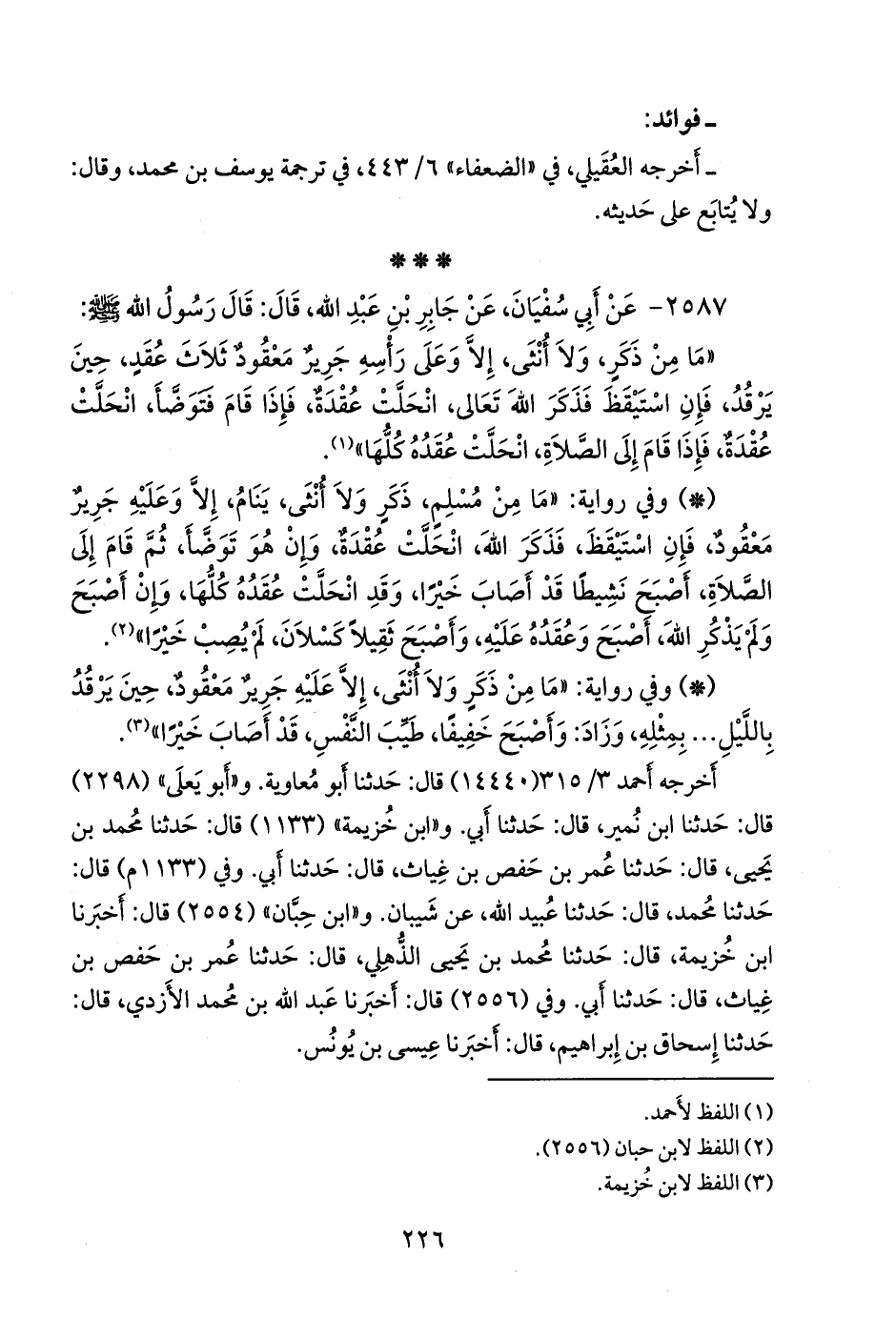 - وفي رواية: «ما من ذكر ولا أنثى، إلا عليه جَرير معقود، حين يرقد بالليل، بمثله، وزاد: وأصبح خفيفا، طيب النفس، قد أصاب خيرا» (¬٣).