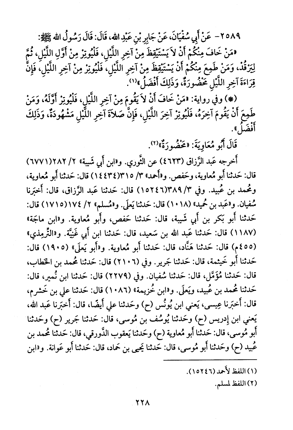 - وفي رواية: «من خاف أن لا يقوم من آخر الليل، فليوتر أوله، ومن طمع أن يقوم آخره، فليوتر آخر الليل، فإن صلاة آخر الليل مشهودة، وذلك أفضل».