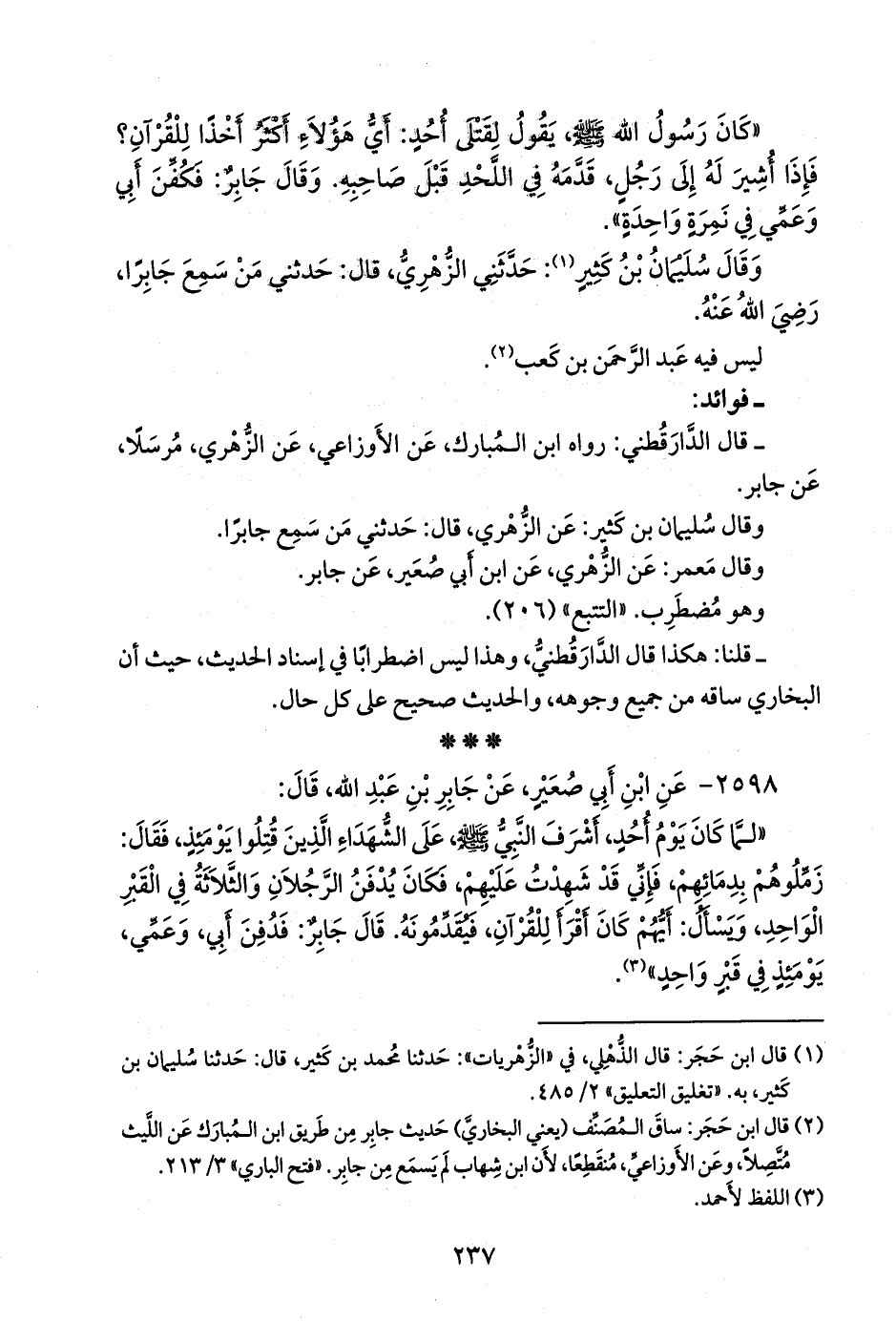 - قال الدارقُطني: أخرج البخاري حديث الليث، عن الزُّهْري، عن عبد الرَّحمَن بن كعب، عن جابر؛ كان يجمع بين قتلى أحد، ويقدم أقرأهم.