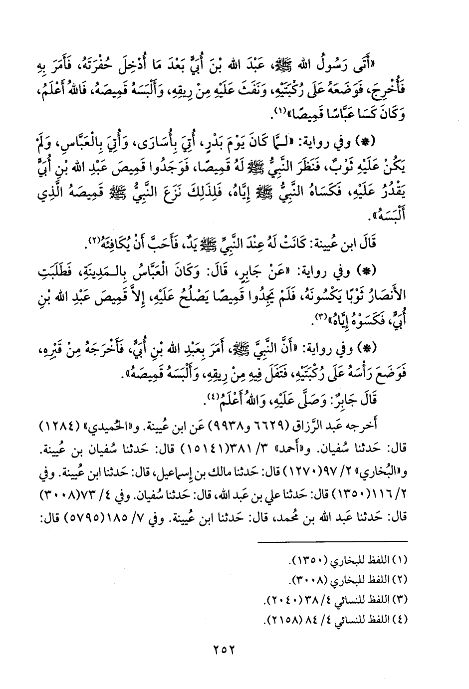- وفي رواية: «أن النبي صَلى الله عَليه وسَلم أمر بعبد الله بن أبي، فأخرجه من قبره، فوضع رأسه على ركبتيه، فتفل فيه من ريقه، وألبسه قميصه».