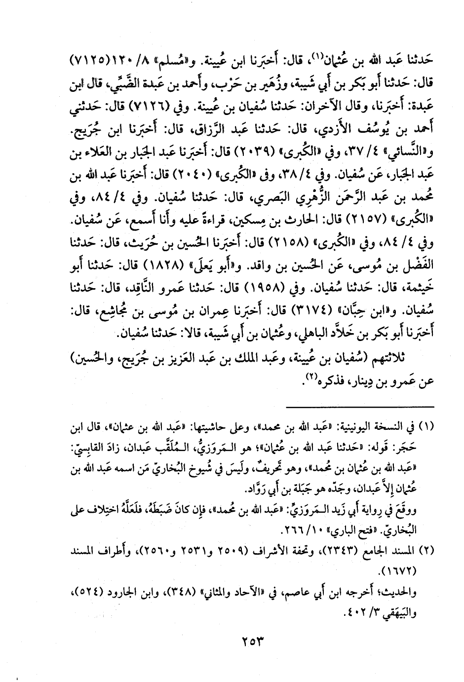 وفي (٧١٢٦) قال: حدثني أحمد بن يوسف الأزدي، قال: حدثنا عبد الرزاق، قال: أخبرنا ابن جُريج. و «النَّسَائي» ٤/ ٣٧، وفي «الكبرى» (٢٠٣٩) قال: أخبرنا عبد الجبار بن العلاء بن عبد الجبار، عن سفيان. وفي ٤/ ٣٨، وفي «الكبرى» (٢٠٤٠) قال: أخبرنا عبد الله بن محمد بن عبد الرَّحمَن الزُّهْري البصري، قال: حدثنا سفيان. وفي ٤/ ٨٤، وفي «الكبرى» (٢١٥٧) قال: الحارث بن مسكين، قراءة عليه وأنا أسمع، عن سفيان. وفي ٤/ ٨٤، وفي «الكبرى» (٢١٥٨) قال: أخبرنا الحسين بن حريث، قال: حدثنا الفضل بن موسى، عن الحسين بن واقد. و «أَبو يَعلى» (١٨٢٨) قال: حدثنا أَبو خيثمة، قال: حدثنا سفيان. وفي (١٩٥٨) قال: حدثنا عَمرو الناقد، قال: حدثنا سفيان. و «ابن حِبَّان» (٣١٧٤) قال: أخبرنا عمران بن موسى بن مجاشع، قال: أخبرنا أَبو بكر بن خلاد الباهلي، وعثمان بن أبي شيبة، قالا: حدثنا سفيان.