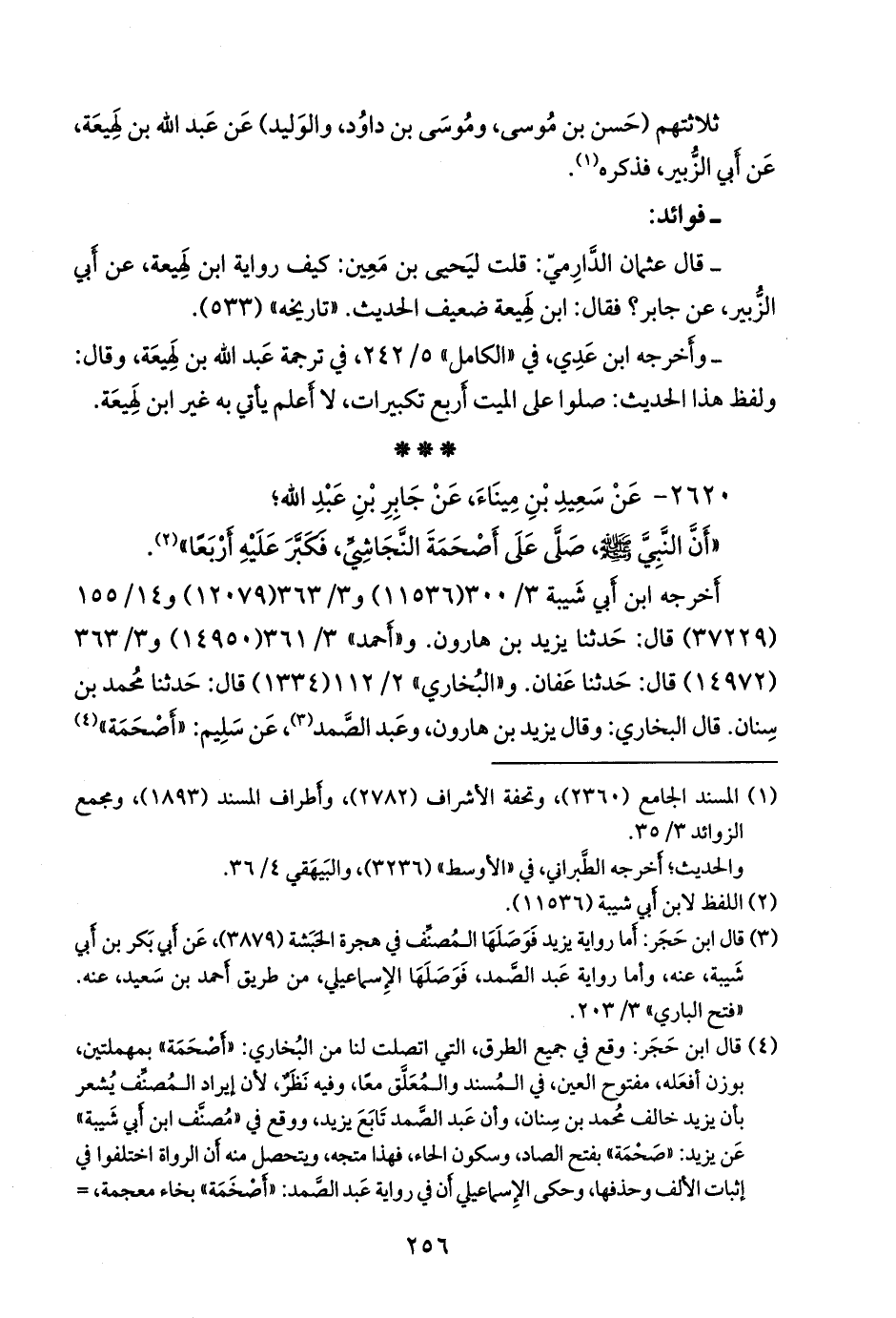 (¬٣) قال ابن حَجَر: وقع في جميع الطرق، التي اتصلت لنا من البخاري: «أصحمة» بمهملتين، بوزن أفعله، مفتوح العين في «المسند» والمُعَلَّق معًا، وفيه نَظر، لأن إيراد المُصَنِّف يُشعر بأن يزيد خالف محمد بن سنان، وأن عبد الصمد تابع يزيد، ووقع في «مصنف ابن أبي شيبة» عن يزيد: «صَحْمة» بفتح الصاد، وسكون الحاء، فهذا متجه، ويتحصل منه أن الرواة اختلفوا في إثبات الألف وحذفها، وحكى الإسماعيلي أن في رواية عبد الصمد: «أصخمة» بخاء معجمة، وإثبات الألف، قال: وهو غلط، فيَحتَمِل أن يكون هذا محل الاختلاف الذي أشار إليه البخاري، وحكى كثير من الشراح أن رواية يزيد ورفيقه: «صحمة» بالمهملة، بغير ألف، وحكى الكِرماني أن في بعض النسخ في رواية محمد بن سنان: «أصحبة» بموحدة، بدل الميم. «فتح الباري» ٣/ ٢٠٣. قلنا: والذي في طبعات دار القِبلة والرشد وإشبيليا لمُصَنَّف ابن أبي شيبة: «أصحمة» بإثبات الألف خلافًا لما ذكره ابن حَجَر.