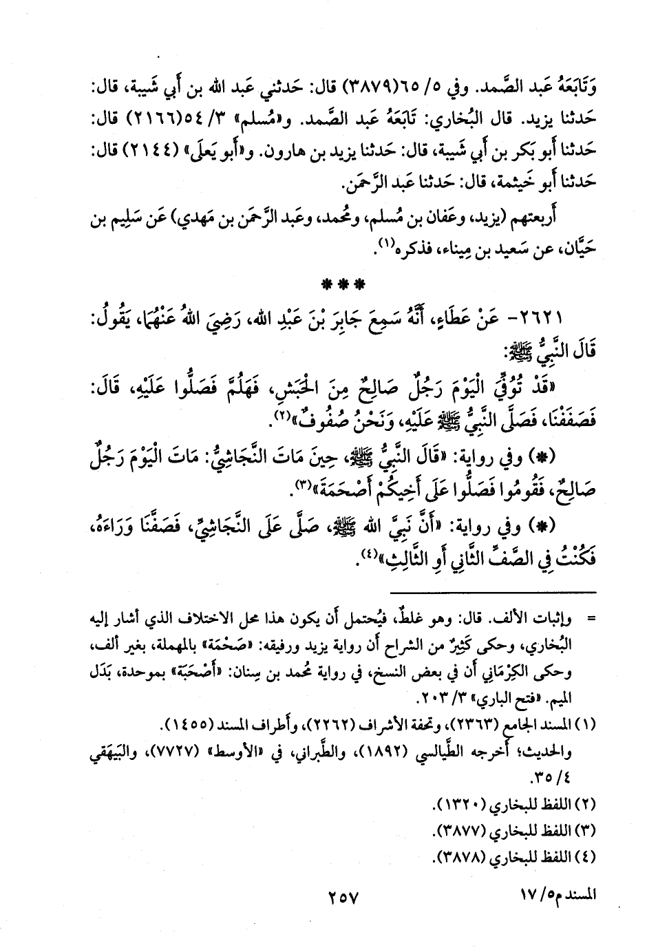 - وفي رواية: «صلوا على أخ لكم مات بغير أرضكم، قالوا: من يا رسول الله؟ قال: النجاشي أصحمة، قال: فقلت: فصففتم عليه؟ قال: نعم، كنت في الصف الثالث» (¬٥).