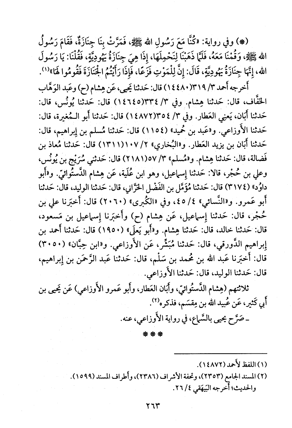 وفي ٣/ ٣٥٤ (١٤٨٧٢) قال: حدثنا أَبو المغيرة، قال: حدثنا الأوزاعي. و «عَبد بن حُميد» (١١٥٤) قال: حدثنا مسلم بن إبراهيم، قال: حدثنا أَبَان بن يزيد العطار. و «البخاري» ٢/ ٨٥ (١٣١١) قال: حدثنا معاذ بن فضالة، قال: حدثنا هشام. و «مسلم» ٣/ ٥٧ (٢١٨١) قال: حدثني سريج بن يونس، وعلي بن حُجْر، قالا: حدثنا إسماعيل، وهو ابن عُلَية، عن هشام الدَّستوائي. و «أَبو داود» (٣١٧٤) قال: حدثنا مُؤَمَّل بن الفضل الحراني، قال: حدثنا الوليد، قال: حدثنا أَبو عَمرو. و «النَّسَائي» ٤/ ٤٥، وفي «الكبرى» (٢٠٦٠) قال: أخبرنا علي بن حُجْر، قال: حدثنا إسماعيل، عن هشام (ح) وأخبرنا إسماعيل بن مسعود، قال: حدثنا خالد، قال: حدثنا هشام. و «أَبو يَعلى» (١٩٥٠) قال: حدثنا أحمد بن إبراهيم الدورقي، قال: حدثنا مبشر، عن الأوزاعي. و «ابن حِبَّان» (٣٠٥٠) قال: أخبرنا عبد الله بن محمد بن سَلم، قال: حدثنا عبد الرَّحمَن بن إبراهيم، قال: حدثنا الوليد، قال: حدثنا الأوزاعي.