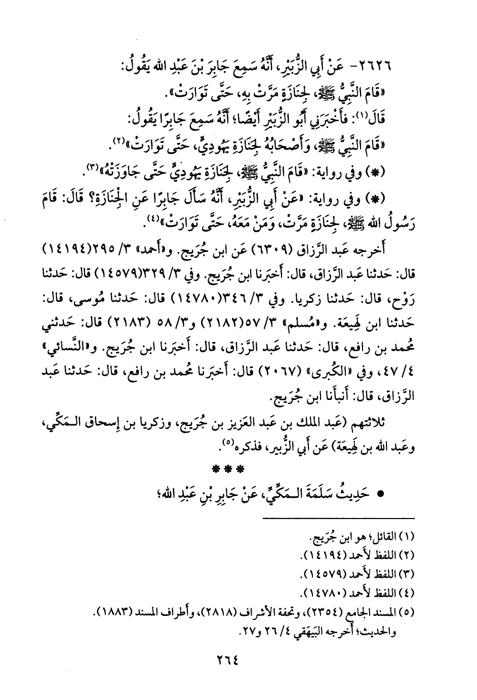 - وفي رواية: «عن أبي الزبير، أنه سأل جابرا عن الجِنازة؟ قال: قام رسول الله صَلى الله عَليه وسَلم لجِنازة مرت، ومن معه، حتى توارت» (¬٤).