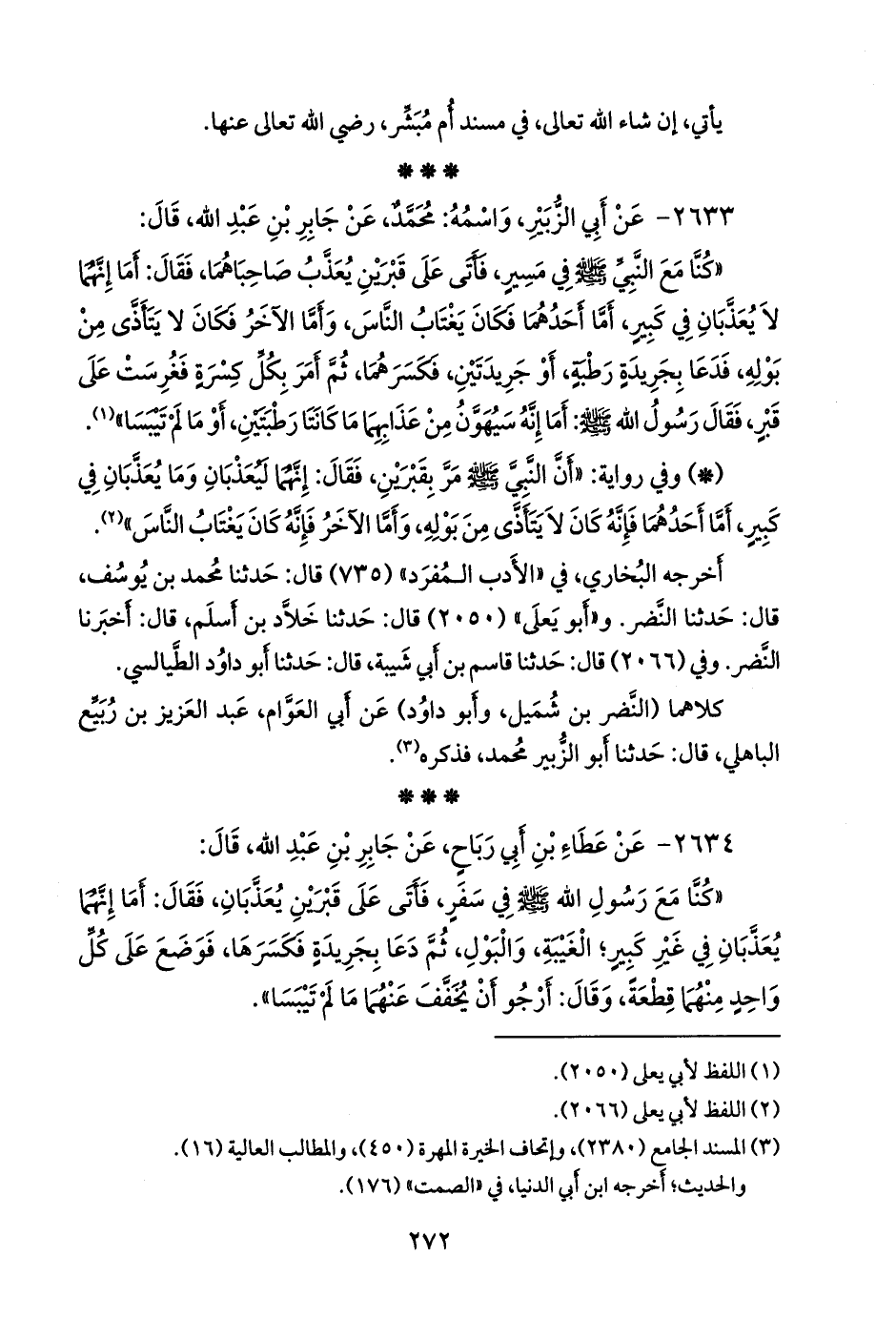 «كنا مع رسول الله صَلى الله عَليه وسَلم في سفر، فأتى على قبرين يعذبان، فقال: أما إنهما يعذبان في غير كبير: الغِيبَة، والبول، ثم دعا بجريدة فكسرها، فوضع على كل واحد منهما قطعة، وقال: أرجو أن يخفف عنهما ما لم ييبسا».
