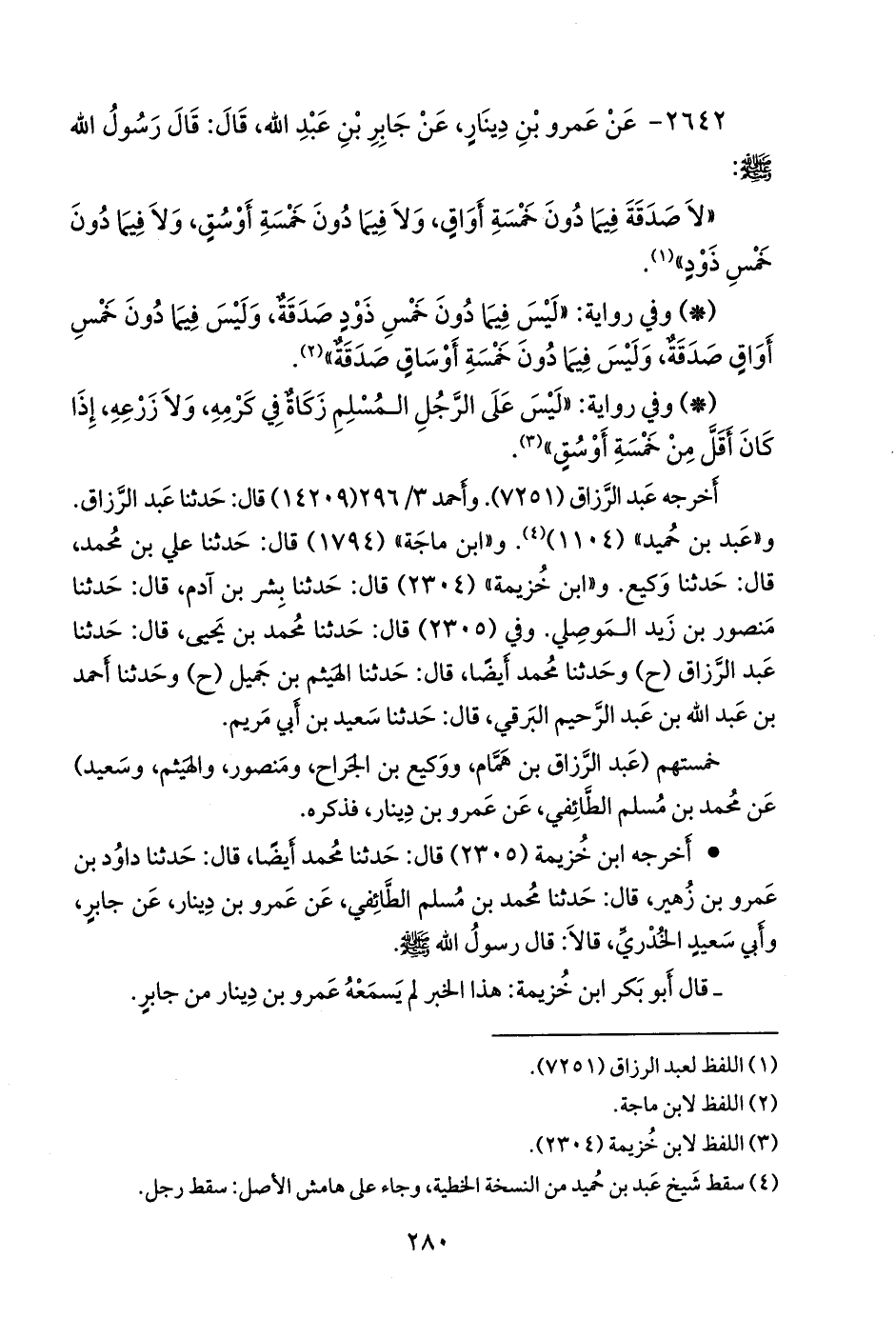 - وأخرجه عبد الرزاق (٧٢٥٠). وابن خزيمة (٢٣٠٦) قال: حدثنا محمد بن يحيى، قال: حدثنا عبد الرزاق، عن ابن جُريج، قال: أخبرني عَمرو بن دينار، قال: سمعت عن غير واحد، عن جابر بن عبد الله، أنه قال: ليس فيما دون خمسة أواق صدقة، وليس فيما دون خمسة أَوسُق من الحب صدقة، وليس فيما دون خمسة أَوسُق من الحلو صدقة. «موقوف» (¬١).