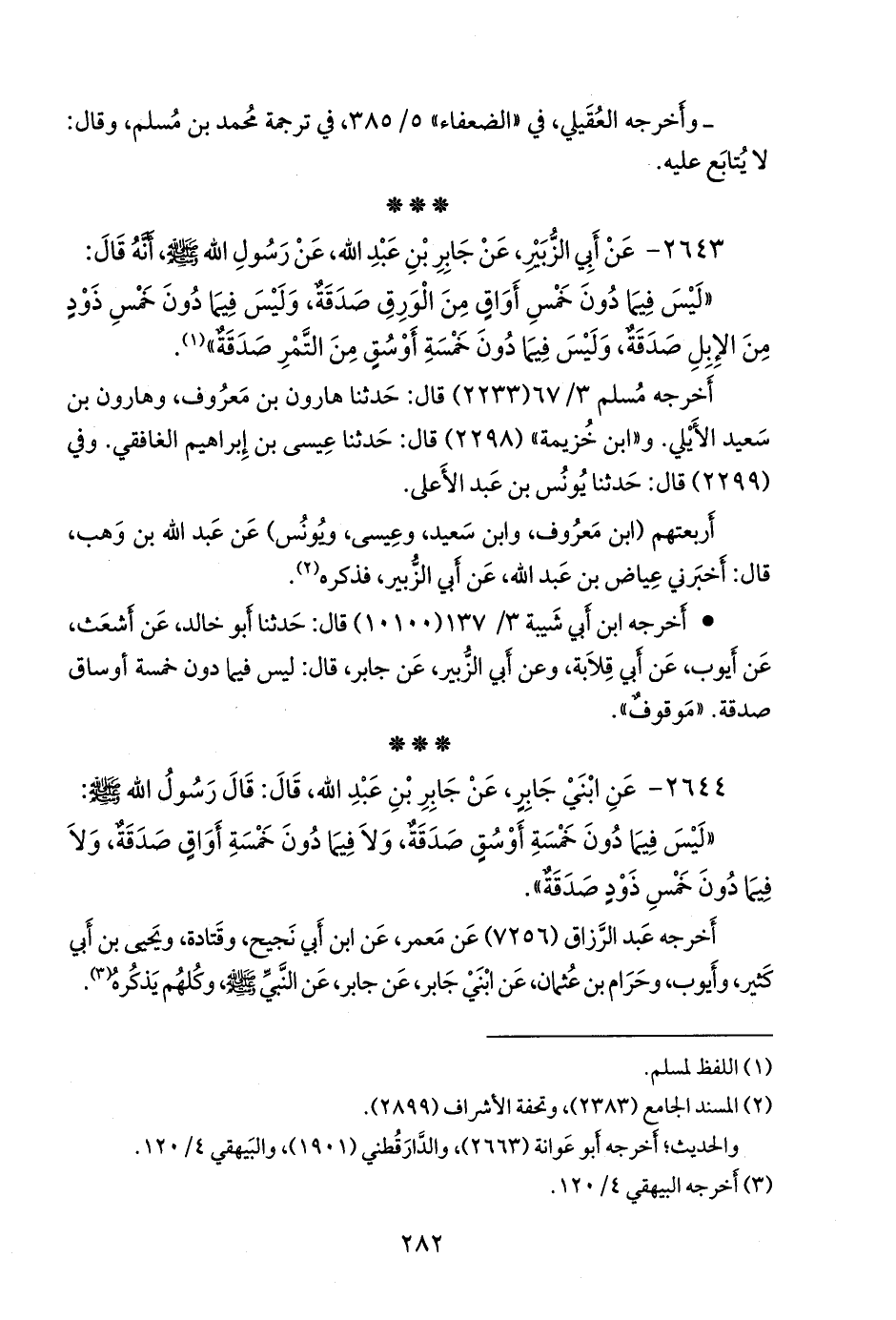 «ليس فيما دون خمسة أَوسق صدقة، ولا فيما دون خمسة أَواق صدقة، وليس فيما دون خمس ذَوْدٍ صدقة».