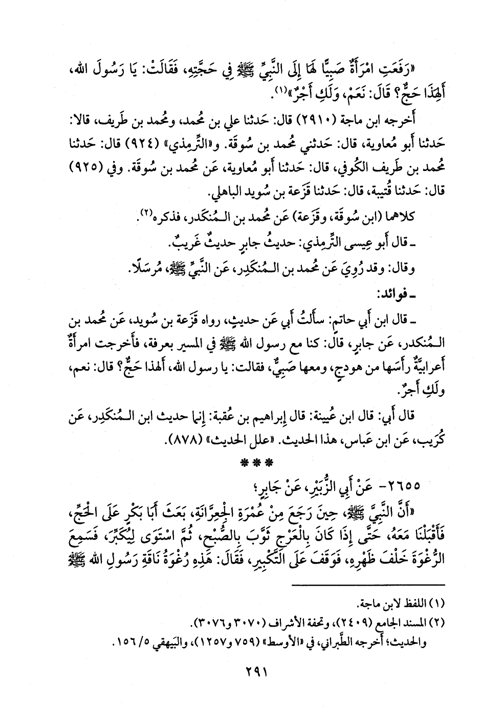 - قال عبد الرَّحمَن بن أبي حاتم الرازي: سألت أبي عن حديث، رواه قزعة بن سويد، عن محمد بن المُنكدِر، عن جابر، قال: كنا مع رسول الله صَلى الله عَليه وسَلم في المسير بعرفة، فأخرجت امرأة أعرابية رأسها من هودج، ومعها صبي، فقالت: يا رسول الله، ألهذا حج؟ قال: نعم، ولك أجر.