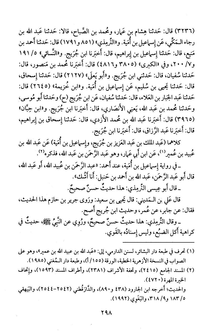 (¬٢) في طبعات المجلس العلمي والتأصيل والكتب العلمية لـ «مُصَنَّف عبد الرزاق»: «عن إسماعيل بن أمية، عن عبد الله بن عبيد قال: سألت جابر بن عبد الله»، ليس بين عبد الله بن عبيد وجابر أَحد، والحديث؛ أخرجه أحمد من طريق عبد الرزاق بإثبات «عبد الرَّحمَن بن عُبيد الله، أَو عبد الله» بينهما.