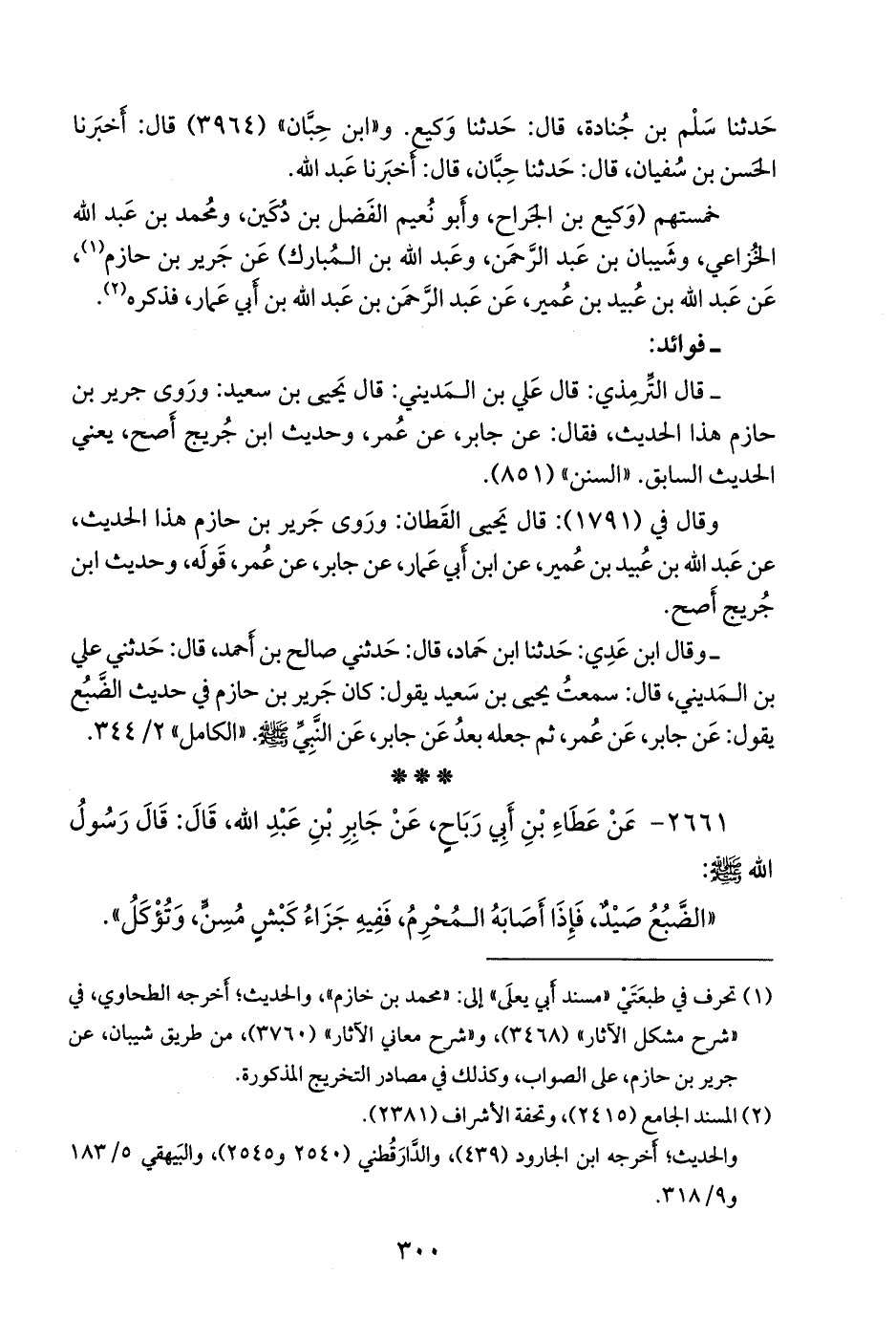 - وقال ابن عَدي: حدثنا ابن حماد، قال: حدثني صالح بن أَحمد، قال: حدثني علي بن المديني، قال: سمعتُ يحيى بن سعيد يقول: كان جَرير بن حازم في حديث الضَّبُع يقول: عن جابر، عن عمر، ثم جعله بعد عن جابر، عن النبي صَلى الله عَليه وسَلم. «الكامل» ٣/ ٥٠.