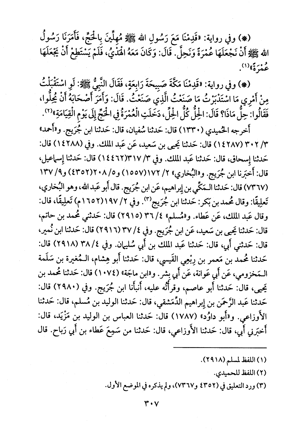 - وفي رواية: «قدمنا مع رسول الله صَلى الله عَليه وسَلم مهلين بالحج، فأمرنا رسول الله صَلى الله عَليه وسَلم أن نجعلها عمرة ونحل. قال: وكان معه الهدي، فلم يستطع أن يجعلها عمرة» (¬١).