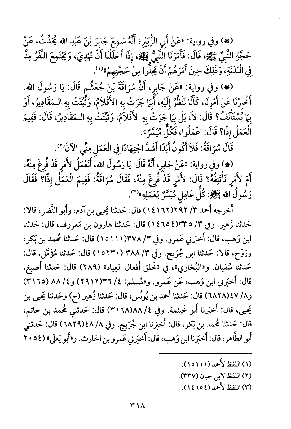 - وفي رواية: «عن جابر، أن سراقة بن جعشم قال: يا رسول الله، أخبرنا عن أمرنا، كأنا ننظر إليه، أبما جرت به الأقلام، وثبتت به المقادير، أو بما يستأنف؟ قال: لا، بل بما جرت به الأقلام، وثبتت به المقادير، قال: ففيم العمل إذا؟ قال: اعملوا، فكل ميسر».