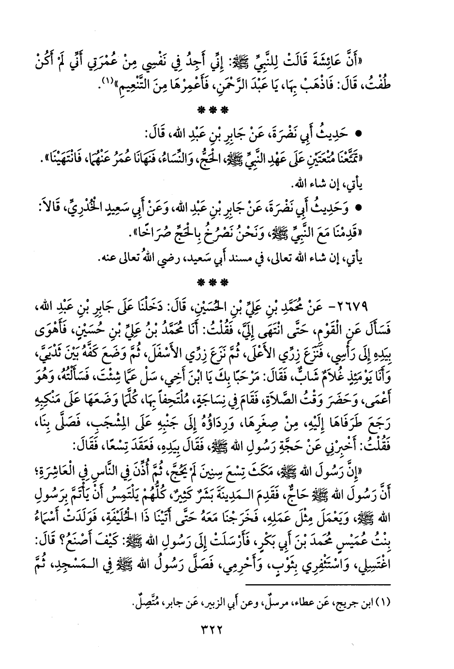٢٦٧٩ - عن محمد بن علي بن الحسين، قال: دخلنا على جابر بن عبد الله، فسأل عن القوم، حتى انتهى إلي، فقلت: أنا محمد بن علي بن حسين، فأهوى بيده إلى رأسي، فنزع زري الأعلى، ثم نزع زري الأسفل، ثم وضع كفه بين ثديي، وأنا يومئذ غلام شاب، فقال: مرحبا بك يا ابن أخي، سل عما شئت، فسألته، وهو أعمى، وحضر وقت الصلاة، فقام في نساجة، ملتحفا بها، كلما وضعها على منكبه رجع طرفاها إليه، من صغرها، ورداؤه إلى جنبه على المشجب، فصلى بنا، فقلت: أخبرني عن حجة رسول الله صَلى الله عَليه وسَلم فقال بيده، فعقد تسعا، فقال: