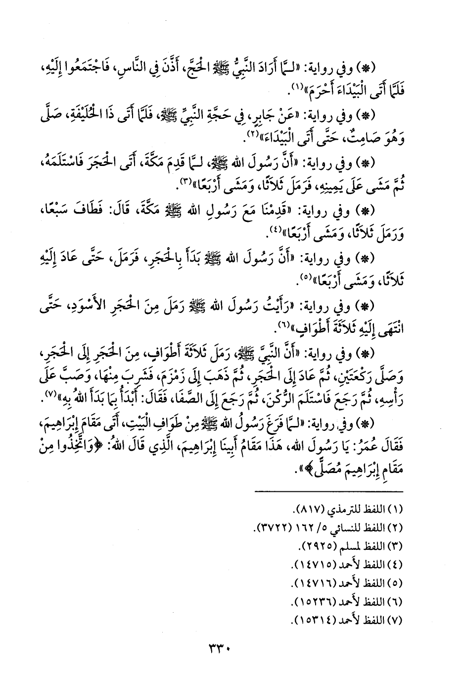 - وفي رواية: «لما فرغ رسول الله صَلى الله عَليه وسَلم من طواف البيت، أتى مقام إبراهيم، فقال عمر: يا رسول الله، هذا مقام أبينا إبراهيم، الذي قال الله: {واتخذوا من مقام إبراهيم مصلى}».
