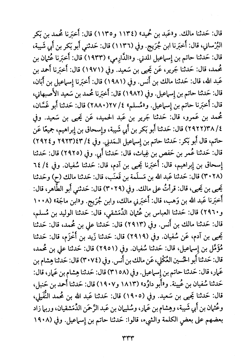 وفي (١٩٨٢) قال: أخبرنا محمد بن سعيد الأصبهاني، قال: أخبرنا حاتم بن إسماعيل. و «مسلم» ٤/ ٢٧ (٢٨٨٠) قال: حدثنا أَبو غسان، محمد بن عَمرو، قال: حدثنا جَرير بن عبد الحميد، عن يحيى بن سعيد. وفي ٤/ ٣٨ (٢٩٢٢) قال: حدثنا أَبو بكر بن أبي شيبة، وإسحاق بن إبراهيم، جميعا عن حاتم، قال أَبو بكر: حدثنا حاتم بن إسماعيل المدني. وفي ٤/ ٤٣ (٢٩٢٣ و ٢٩٢٤) قال: حدثنا عمر بن حفص بن غياث، قال: حدثنا أبي. وفي (٢٩٢٥) قال: حدثنا إسحاق بن إبراهيم، قال: أخبرنا يحيى بن آدم، قال: حدثنا سفيان. وفي ٤/ ٦٤ (٣٠٢٨) قال: حدثنا عبد الله بن مَسلَمة بن قعنب، قال: حدثنا مالك (ح) وحدثنا يحيى بن يحيى، قال: قرأت على مالك. وفي (٣٠٢٩) قال: حدثني أَبو الطاهر، قال: أخبرنا عبد الله بن وهب، قال: أخبرني مالك، وابن جُريج. و «ابن ماجة» (١٠٠٨ و ٢٩٦٠) قال: حدثنا العباس بن عثمان الدمشقي، قال: حدثنا الوليد بن مسلم، قال: حدثنا مالك بن أنس. وفي (٢٩١٣) قال: حدثنا علي بن محمد، قال: حدثنا يحيى بن آدم، عن سفيان. وفي (٢٩١٩) قال: حدثنا زيد بن أخزم، قال: حدثنا مُؤَمَّل بن إسماعيل، قال: حدثنا سفيان. وفي (٢٩٥١) قال: حدثنا علي بن محمد، قال: حدثنا أَبو الحسين العكلي، عن مالك بن أنس. وفي (٣٠٧٤) قال: حدثنا هشام بن عمار، قال: حدثنا حاتم بن إسماعيل. وفي (٣١٥٨) قال: حدثنا هشام بن عمار، قال: حدثنا سفيان بن عُيينة. و «أَبو داود» (١٨١٣ و ١٩٠٧) قال: حدثنا أحمد بن حنبل، قال: حدثنا يحيى بن سعيد. وفي (١٩٠٥) قال: حدثنا عبد الله بن محمد النفيلي، وعثمان بن أبي شيبة، وهشام بن عمار، وسليمان بن عبد الرَّحمَن الدمشقيان، وربما زاد بعضهم على بعض الكلمة والشيء، قالوا: حدثنا حاتم بن إسماعيل. وفي (١٩٠٨
