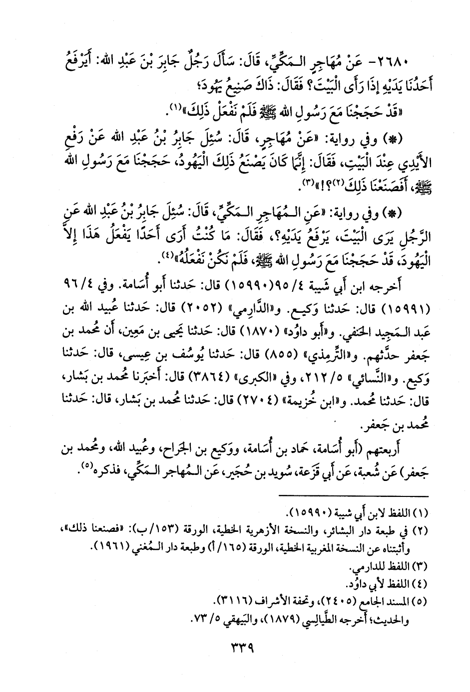 ٢٦٨٠ - عن مهاجر المكي، قال: سأل رجل جابر بن عبد الله: أيرفع أحدنا يديه إذا رأى البيت؟ فقال: ذاك صنيع يهود؛