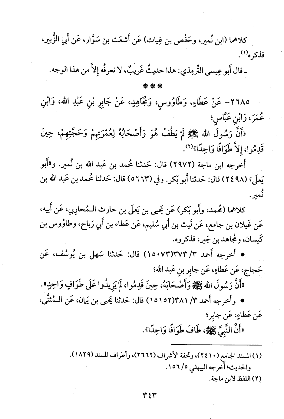 «أن رسول الله صَلى الله عَليه وسَلم لم يطف هو وأصحابه لعمرتهم وحجتهم، حين قدموا، إلا طوافا واحدا» (¬١).