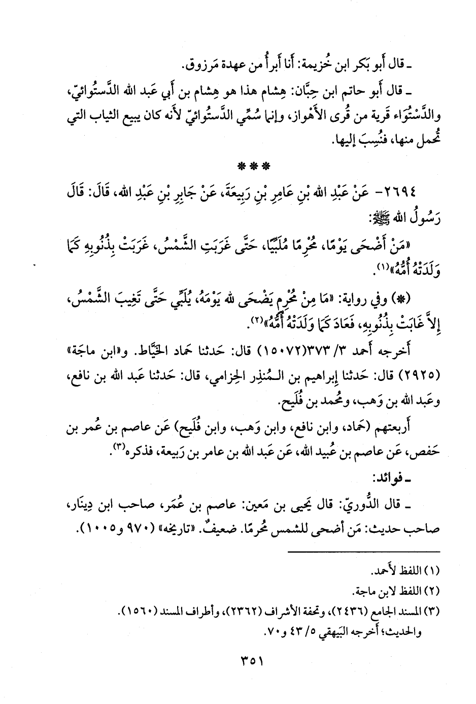 أربعتهم (حماد، وابن نافع، وابن وهب، وابن فليح) عن عاصم بن عمر بن حفص، عن عاصم بن عُبيد الله، عن عبد الله بن عامر بن ربيعة، فذكره (¬٣).