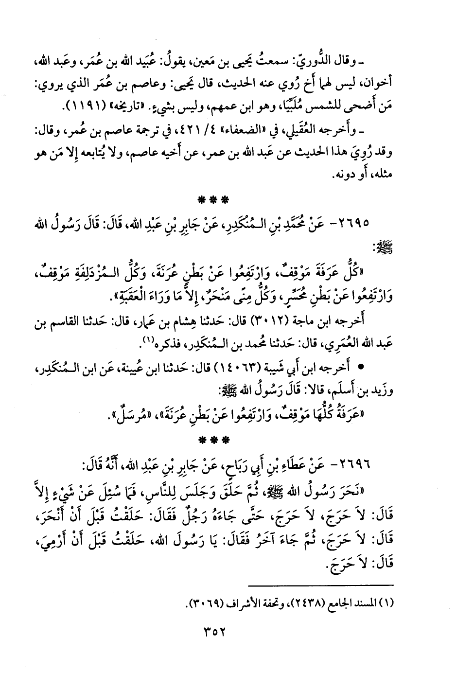 «عرفة كلها موقف، وارتفعوا عن بطن عرنة»، «مُرسَل».