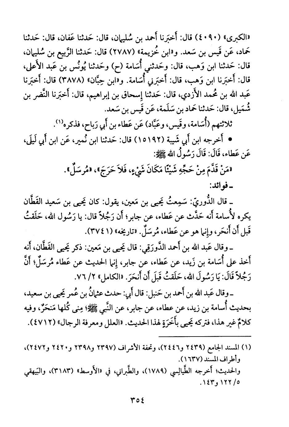 - وقال عبد الله بن أحمد الدورقي: قال يحيى بن مَعين: ذكر يحيى القطان، أنه أخذ على أُسامة بن زيد، عن عطاء، عن جابر، إنما الحديث عن عطاء مرسل؛ أن رجلا قال: يا رسول الله، حلقت قبل أن أنحر. «الكامل» ٢/ ٧٦.