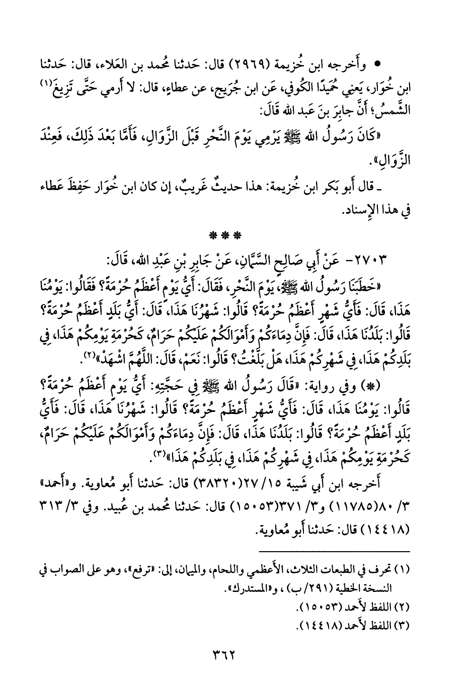 «خطبنا رسول الله صَلى الله عَليه وسَلم يوم النحر، فقال: أي يوم أعظم حرمة؟ فقالوا: يومنا هذا، قال: فأي شهر أعظم حرمة؟ قالوا: شهرنا هذا، قال: أي بلد أعظم حرمة؟ قالوا: بلدنا هذا، قال: فإن دماءكم وأموالكم عليكم حرام، كحرمة يومكم هذا، في بلدكم هذا، في شهركم هذا، هل بلغت؟ قالوا: نعم، قال: اللهم اشهد» (¬١).