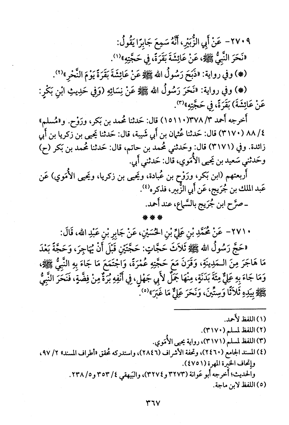 «حج رسول الله صَلى الله عَليه وسَلم ثلاث حجات: حجتين قبل أن يهاجر، وحجة بعد ما هاجر من المدينة، وقرن مع حجته عمرة، واجتمع ما جاء به النبي صَلى الله عَليه وسَلم وما جاء به علي مئة بدنة، منها جمل لأبي جهل، في أنفه برة من فضة، فنحر النبي صَلى الله عَليه وسَلم بيده ثلاثا وستين، ونحر علي ما غبر» (¬١).