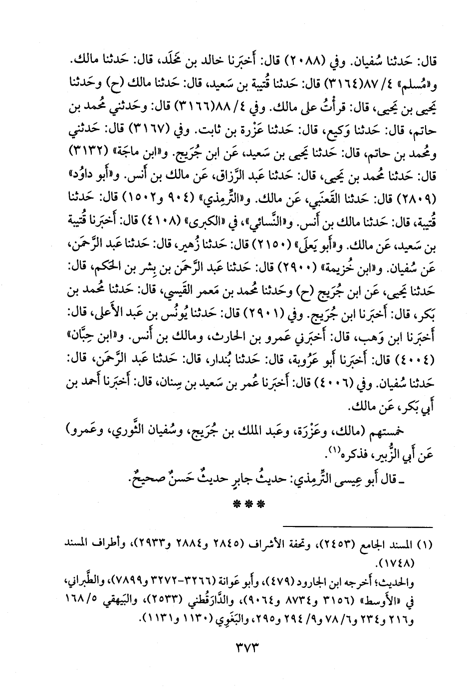 وفي (٢٠٨٨) قال: أخبرنا خالد بن مخلد، قال: حدثنا مالك. و «مسلم» ٤/ ٨٧ (٣١٦٤) قال: حدثنا قتيبة بن سعيد، قال: حدثنا مالك (ح) وحدثنا يحيى بن يحيى، قال: قرأت على مالك. وفي ٤/ ٨٨ (٣١٦٦) قال: وحدثني محمد بن حاتم، قال: حدثنا وكيع، قال: حدثنا عَزرة بن ثابت. وفي (٣١٦٧) قال: حدثني محمد بن حاتم، قال: حدثنا يحيى بن سعيد، عن ابن جُريج. و «ابن ماجة» (٣١٣٢) قال: حدثنا محمد بن يحيى، قال: حدثنا عبد الرزاق، عن مالك بن أنس. و «أَبو داود» (٢٨٠٩) قال: حدثنا القَعنَبي، عن مالك. و «التِّرمِذي» (٩٠٤ و ١٥٠٢) قال: حدثنا قتيبة، قال: حدثنا مالك بن أنس. و «النَّسَائي» في «الكبرى» (٤١٠٨) قال: أخبرنا قتيبة بن سعيد، عن مالك. و «أَبو يَعلى» (٢١٥٠) قال: حدثنا زهير، قال: حدثنا عبد الرَّحمَن، عن سفيان. و «ابن خزيمة» (٢٩٠٠) قال: حدثنا عبد الرَّحمَن بن بشر بن الحكم، قال: حدثنا يحيى، عن ابن جُريج (ح) وحدثنا محمد بن معمر القيسي، قال: حدثنا محمد بن بكر، قال: أخبرنا ابن جُريج. وفي (٢٩٠١) قال: حدثنا يونس بن عبد الأعلى، قال: أخبرنا ابن وهب، قال: أخبرني عَمرو بن الحارث، ومالك بن أنس. و «ابن حِبَّان» (٤٠٠٤) قال: أخبرنا أَبو عَروبَة، قال: حدثنا بُندَار، قال: حدثنا عبد الرَّحمَن، قال: حدثنا سفيان. وفي (٤٠٠٦) قال: أخبرنا عمر بن سعيد بن سنان، قال: أخبرنا أحمد بن أَبي بكر، عن مالك.