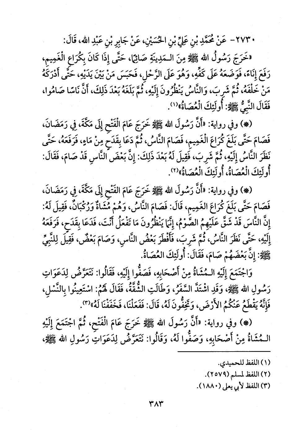 - وفي رواية: «أن رسول الله صَلى الله عَليه وسَلم خرج عام الفتح إلى مكة، في رمضان، فصام حتى بلغ كراع الغميم، قال: فصام الناس، وهم مشاة وركبان، فقيل له: إن الناس قد شق عليهم الصوم، إنما ينظرون ما تفعل أنت، فدعا بقدح، فرفعه إليه، حتى نظر الناس، ثم شرب، فأفطر بعض الناس، وصام بعض، فقيل للنبي صَلى الله عَليه وسَلم: إن بعضهم صام، فقال: أولئك العصاة.