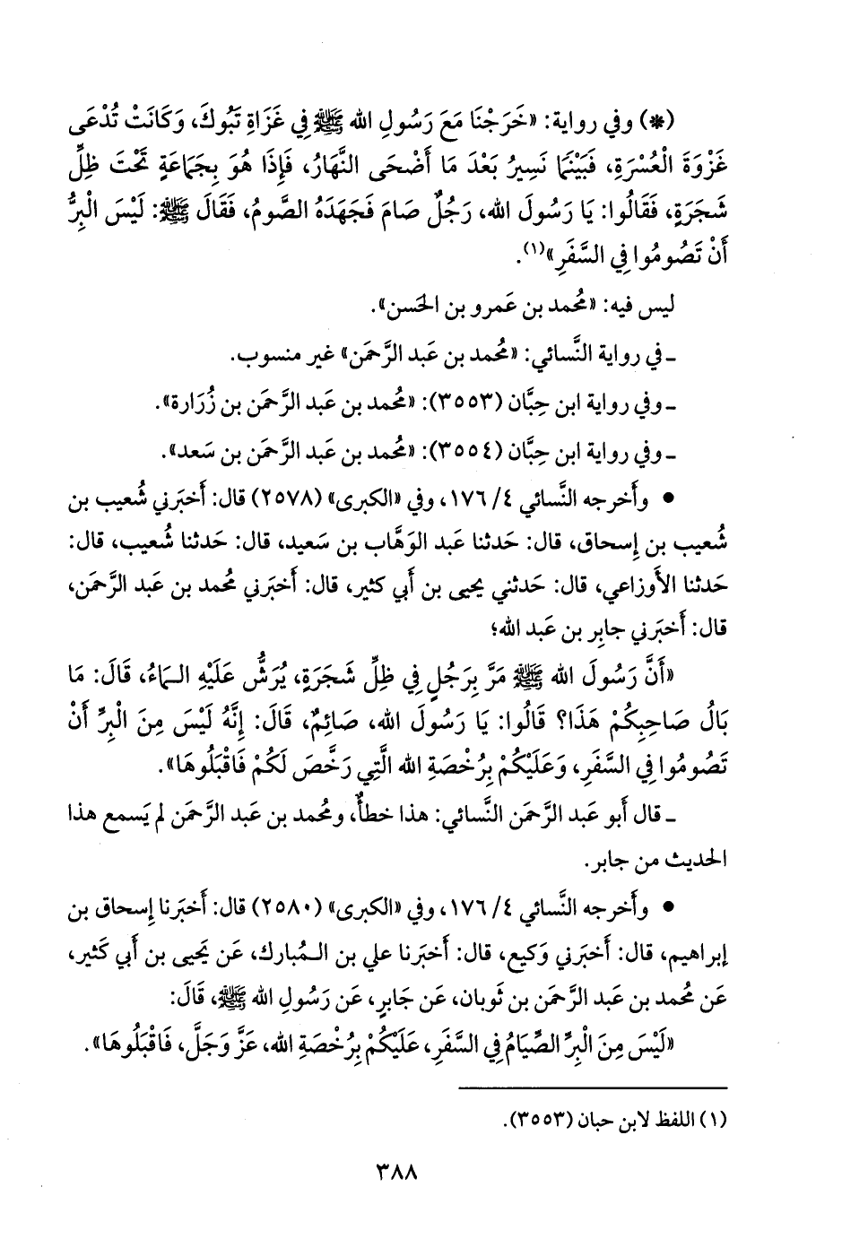 «أن رسول الله صَلى الله عَليه وسَلم مر برجل في ظل شجرة، يرش عليه الماء، قال: ما بال صاحبكم هذا؟ قالوا: يا رسول الله، صائم، قال: إنه ليس من البر أن تصوموا في السفر، وعليكم برخصة الله التي رخص لكم فاقبلوها».