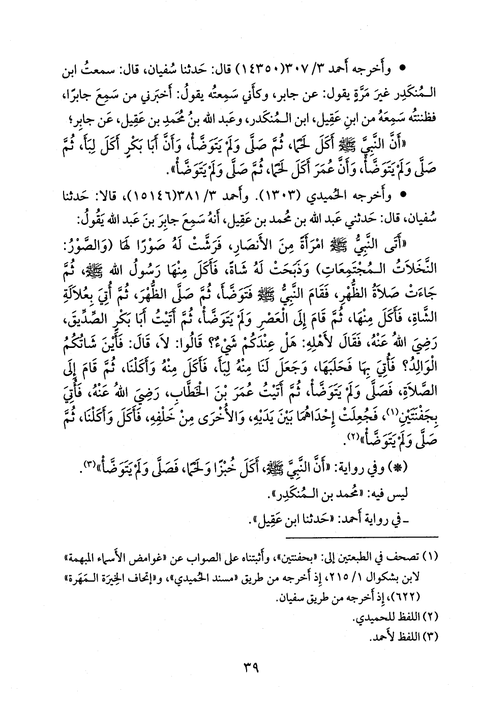 - وأخرجه الحُميدي (١٣٠٣). وأحمد (١٥١٤٦)، قالا: حدثنا سفيان، قال: حدثني عبد الله بن محمد بن عَقيل، أنه سمع جابر بن عبد الله يقول: