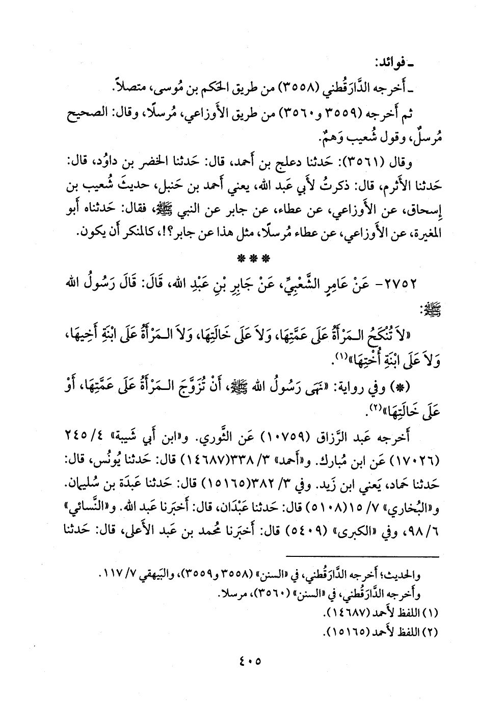 وقال (٣٥٦١): حدثنا دعلج بن أحمد، قال: حدثنا الخضر بن داود، قال: حدثنا الأثرم، قال: ذكرت لأبي عبد الله، يعني أحمد بن حنبل، حديث شعيب بن إسحاق، عن الأوزاعي، عن عطاء، عن جابر عن النبي صَلى الله عَليه وسَلم فقال: حدثناه أَبو المغيرة، عن الأوزاعي، عن عطاء مرسلا، مثل هذا عن جابر؟!، كالمنكر أن يكون.