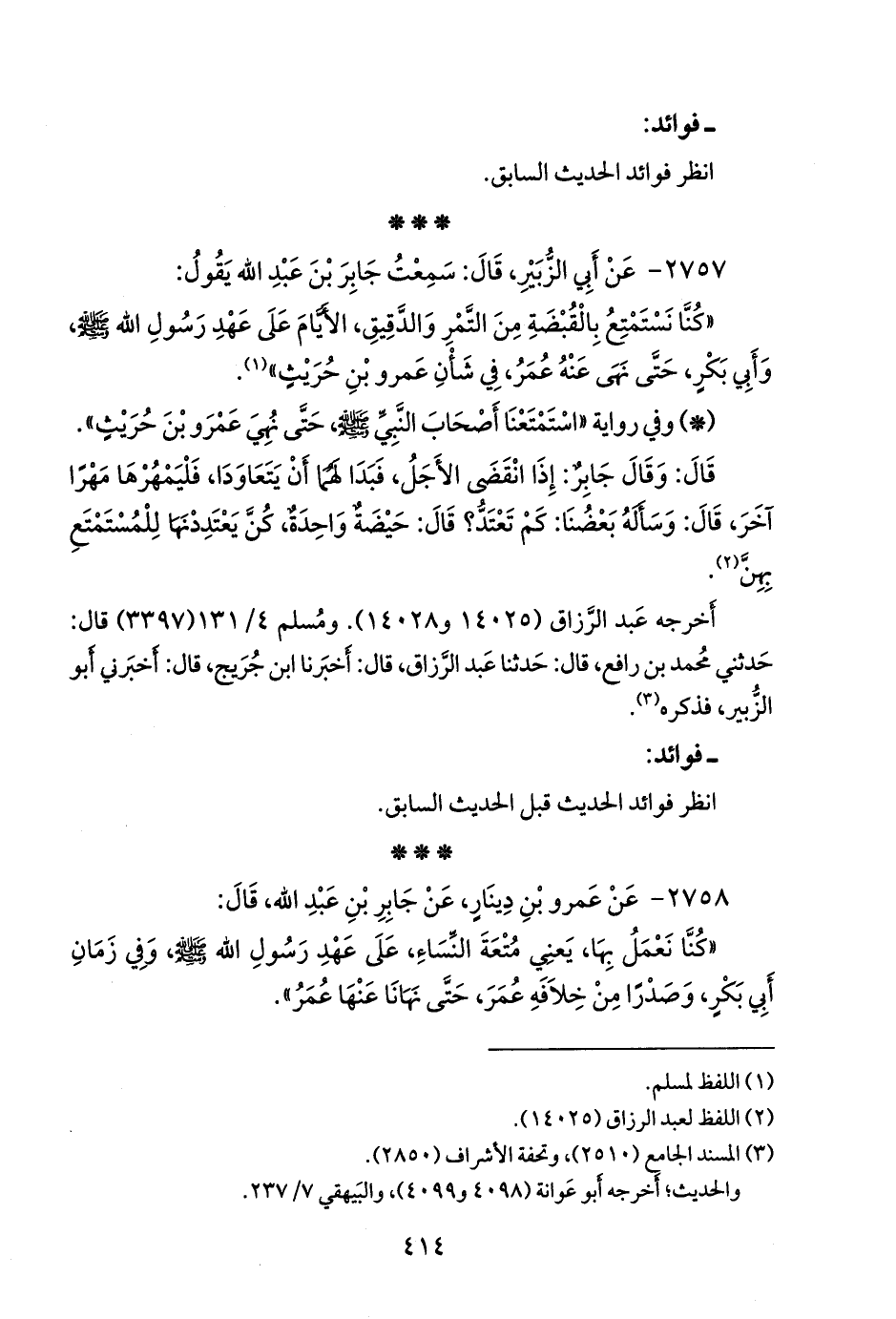 «كنا نعمل بها، يعني متعة النساء، على عهد رسول الله صَلى الله عَليه وسَلم وفي زمان أَبي بكر، وصدرا من خلافة عمر، حتى نهانا عنها عمر».