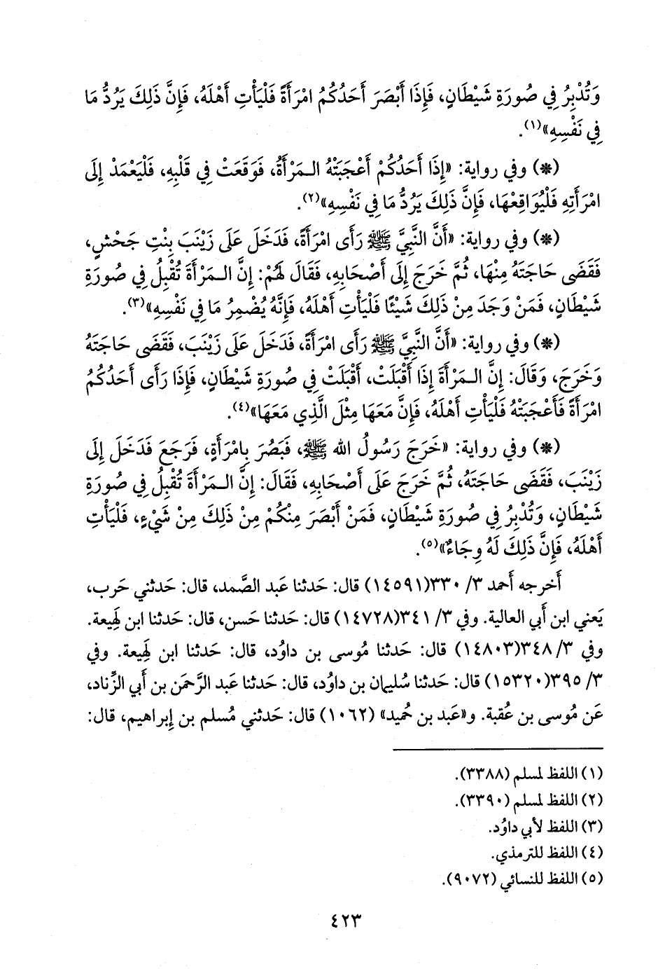- وفي رواية: «خرج رسول الله صَلى الله عَليه وسَلم فبصر بامرأة، فرجع فدخل إلى زينب، فقضى حاجته، ثم خرج على أصحابه، فقال: إن المرأة تقبل في صورة شيطان، وتدبر في صورة شيطان، فمن أبصر منكم من ذلك من شيء، فليأت أهله، فإن ذلك له وجاء» (¬١).