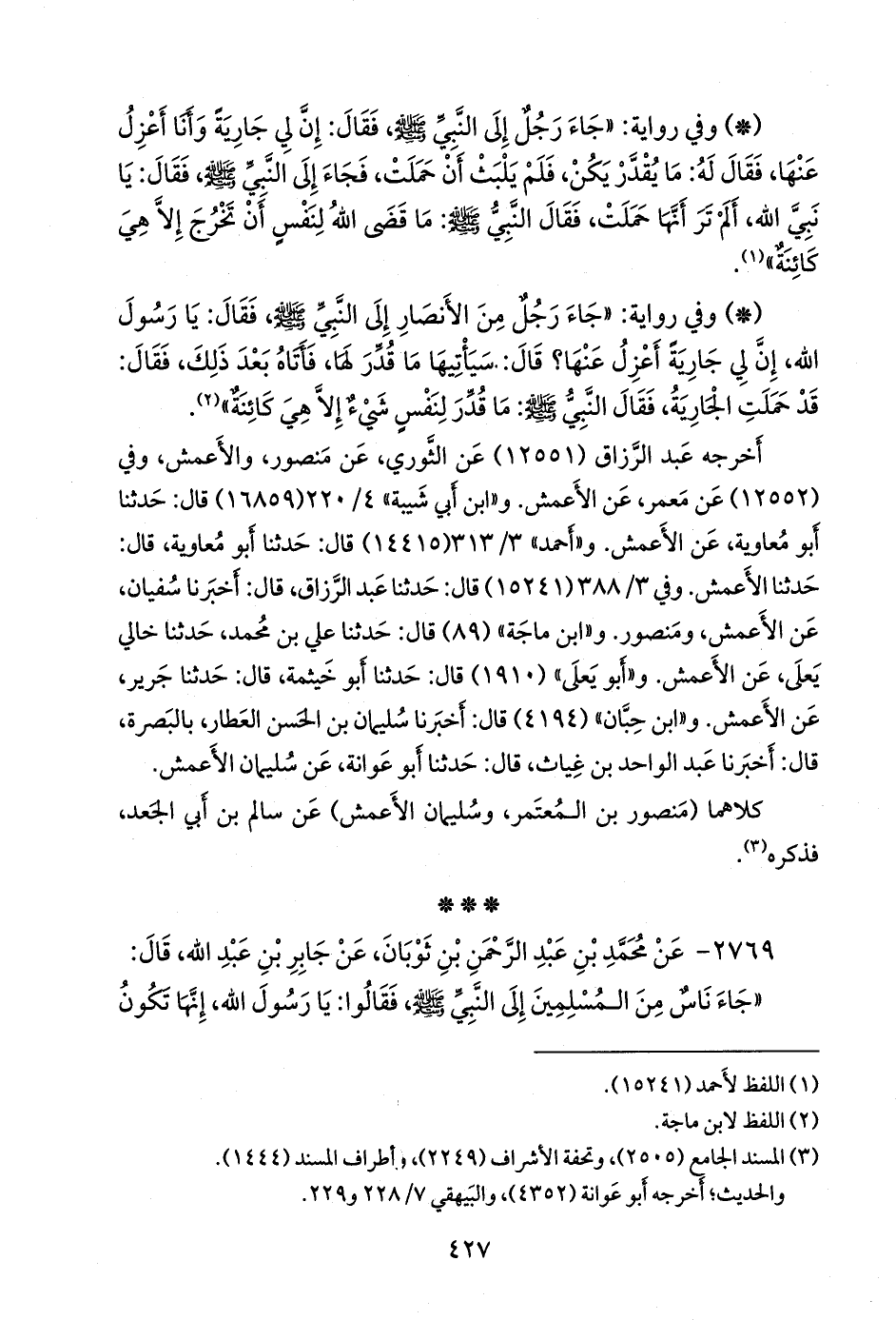 - وفي رواية: «كانت لنا جوار وكنا نعزل عنهن، فقال اليهود: إن تلك الموؤودة الصغرى، فسئل رسول الله صَلى الله عَليه وسَلم عن ذلك، فقال كذبت يهود، لو أراد الله أن يخلقه، لم تستطع رده» (¬٣).