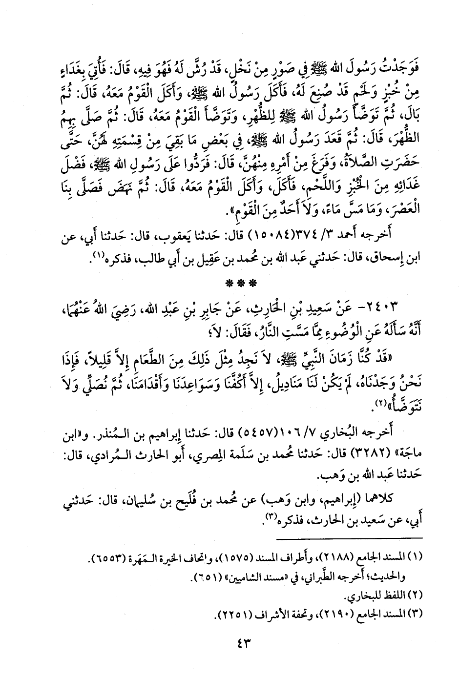٢٤٠٣ - عن سعيد بن الحارث، عن جابر بن عبد الله، رضي الله عنهما، أنه سأله عن الوضوء مما مست النار، فقال: لا؛