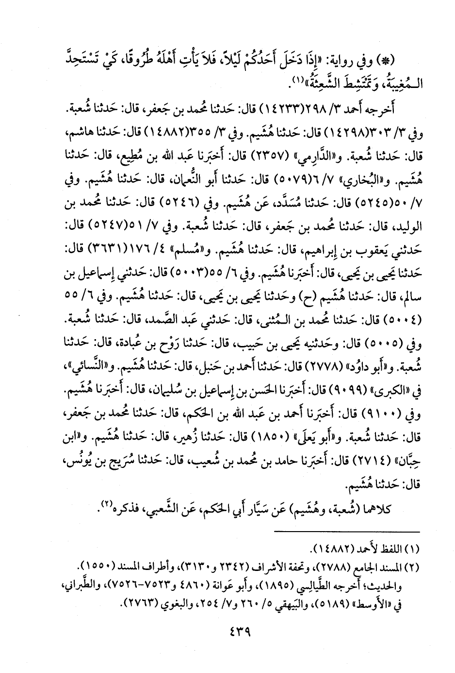 وفي ٧/ ٣٩ (٥٢٤٧) قال: حدثني يعقوب بن إبراهيم، قال: حدثنا هُشيم. و «مسلم» ٤/ ١٧٦ (٣٦٣١) قال: حدثنا يحيى بن يحيى، قال: أخبرنا هُشيم. وفي ٦/ ٥٥ (٥٠٠٣) قال: حدثني إسماعيل بن سالم، قال: حدثنا هُشيم (ح) وحدثنا يحيى بن يحيى، قال: حدثنا هُشيم. وفي ٦/ ٥٥ (٥٠٠٤) قال: حدثنا محمد بن المثنى، قال: حدثني عبد الصمد، قال: حدثنا شعبة. وفي (٥٠٠٥) قال: وحدثنيه يحيى بن حبيب، قال: حدثنا روح بن عبادة، قال: حدثنا شعبة. و «أَبو داود» (٢٧٧٨) قال: حدثنا أحمد بن حنبل، قال: حدثنا هُشيم. و «النَّسَائي» في «الكبرى» (٩٠٩٩) قال: أخبرنا الحسن بن إسماعيل بن سليمان، قال: أخبرنا هُشيم. وفي (٩١٠٠) قال: أخبرنا أحمد بن عبد الله بن الحكم، قال: حدثنا محمد بن جعفر، قال: حدثنا شعبة. و «أَبو يَعلى» (١٨٥٠) قال: حدثنا زهير، قال: حدثنا هُشيم. و «ابن حِبَّان» (٢٧١٤) قال: أخبرنا حامد بن محمد بن شعيب، قال: حدثنا سريج بن يونس، قال: حدثنا هُشيم.