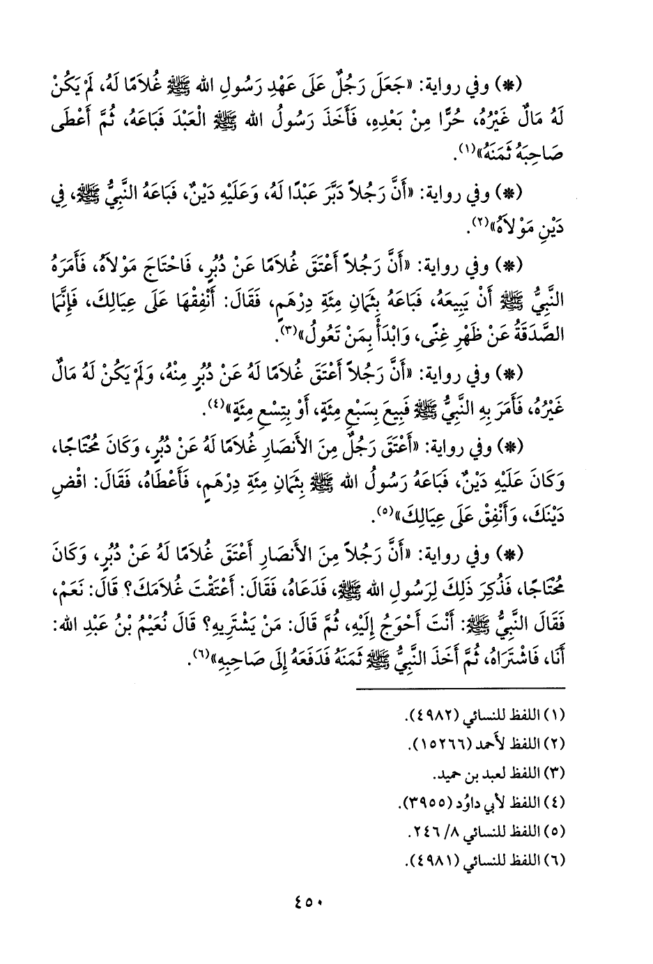 - وفي رواية: «أن رجلا من الأنصار أعتق غلاما له عن دبر، وكان محتاجا، فذكر ذلك لرسول الله صَلى الله عَليه وسَلم فدعاه، فقال: أعتقت غلامك؟ قال: نعم، فقال النبي صَلى الله عَليه وسَلم: أنت أحوج إليه، ثم قال: من يشتريه؟ قال نعيم بن عبد الله: أنا، فاشتراه، ثم أخذ النبي صَلى الله عَليه وسَلم ثمنه فدفعه إلى صاحبه» (¬٣).